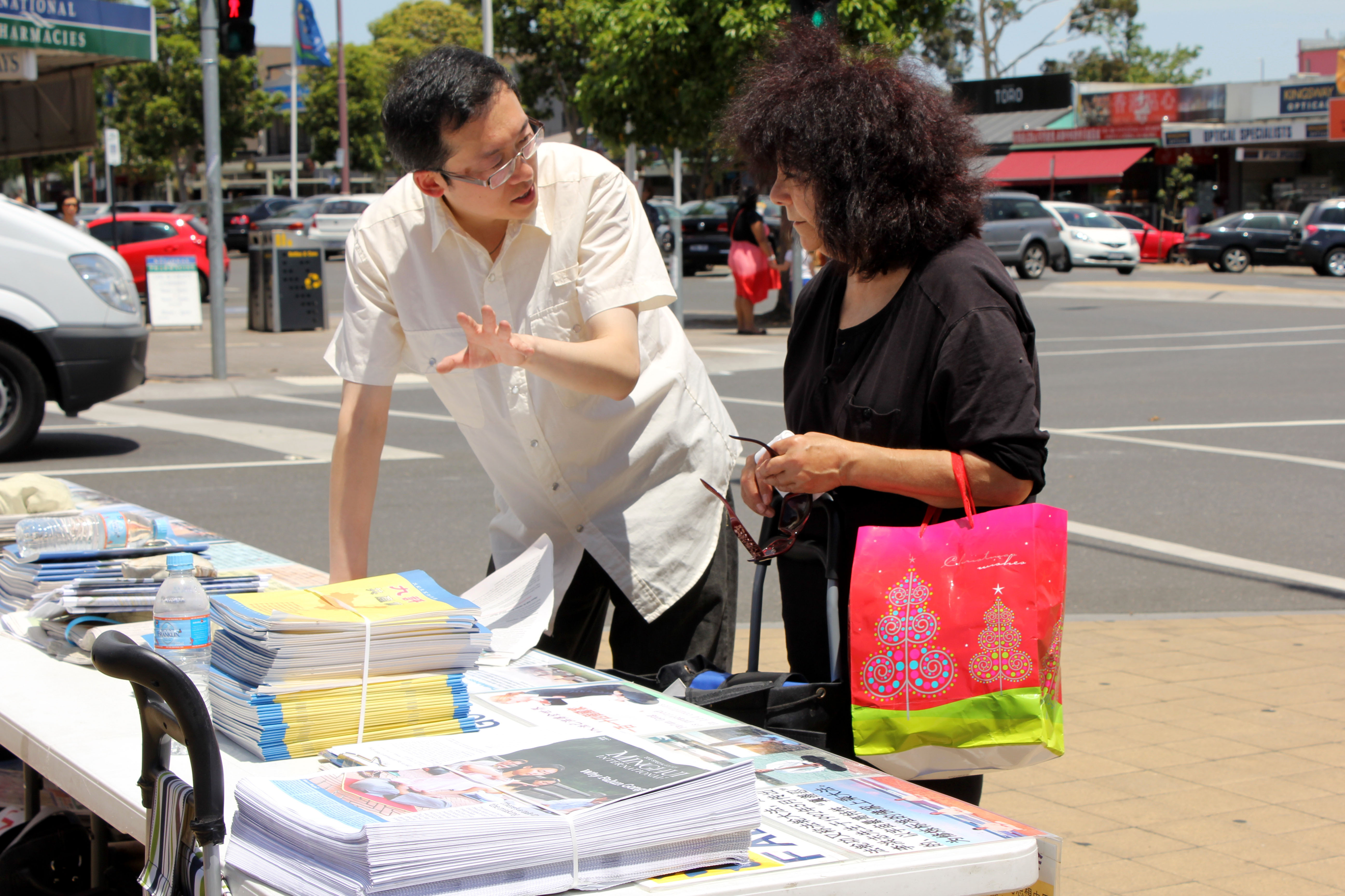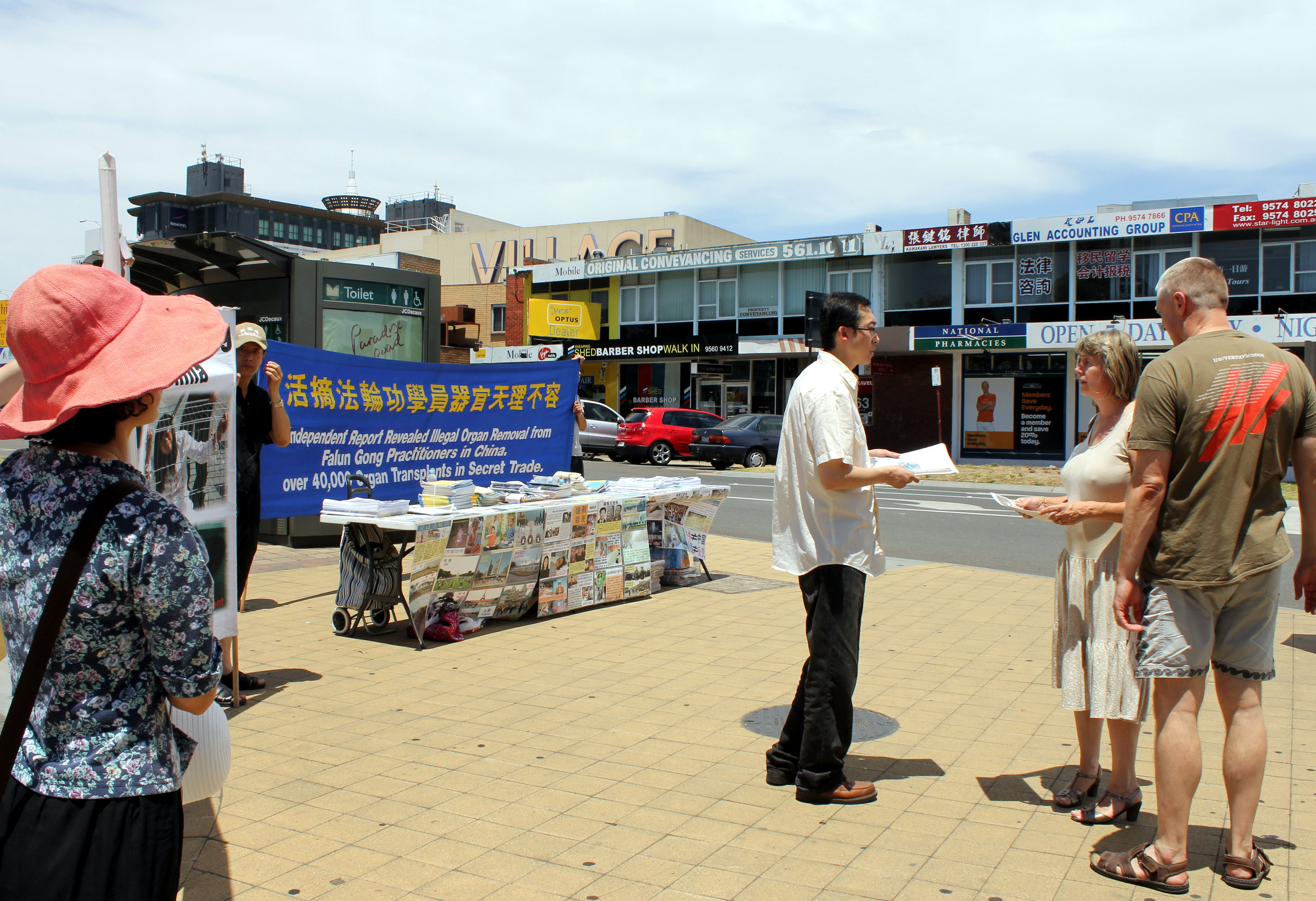【明慧网二零一三年一月七日】(明慧记者夏纯清澳洲墨尔本报道)二零一三年一月五日,在澳洲墨尔本华人聚居的格兰韦弗利(Glen Waverley)区购物中心的主要干道旁,当地法轮功学员利用横幅、展板和真相资料,呼吁民众关注中共活摘器官暴行并帮助制止迫害