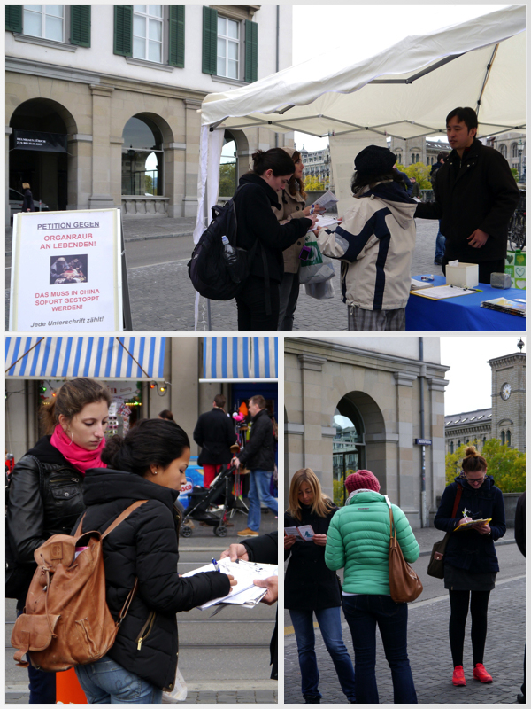路人在苏黎世古城区希尔申广场(Hirschenplatz)签名制止中共活摘法轮功学员器官