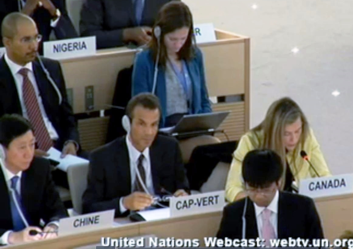 ![]() 二零一三年十月二十二日,加拿大代表(右一)在联合国人权会议上再次提出中国对包括法轮功在内的宗教、信仰迫害的问题。(网络截图) |