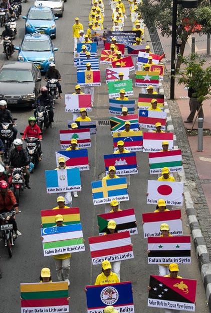 第二天,数百名法轮功学员来到雅加达繁华的市中心开始游行,沿途展示法轮大法的美好,揭露中共对法轮功长达十四年多的迫害。游行队伍的先导是天国乐团,他们的演奏吸引了众多路人的目光。印尼的人权组织也制作了横幅表示支持,其中一个横幅是印尼著名诗人陶菲克·伊斯梅尔(Taufik Ismail)对法轮功表达的支持:“停止迫害法轮大法,将恶人绳之以法。”游行过程中,数千张真相传单发到了路人手中。