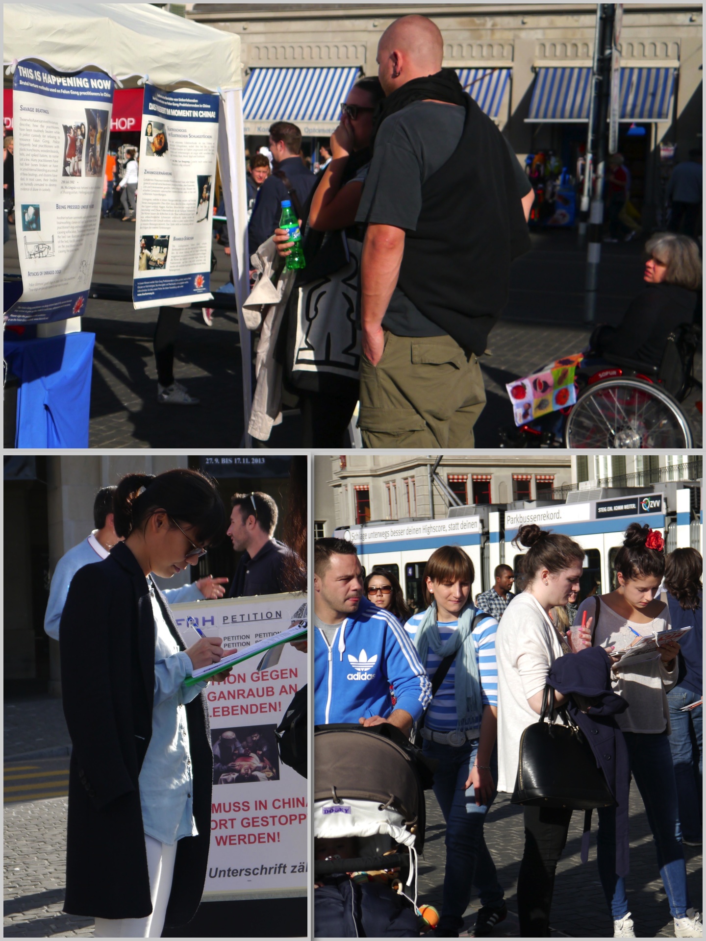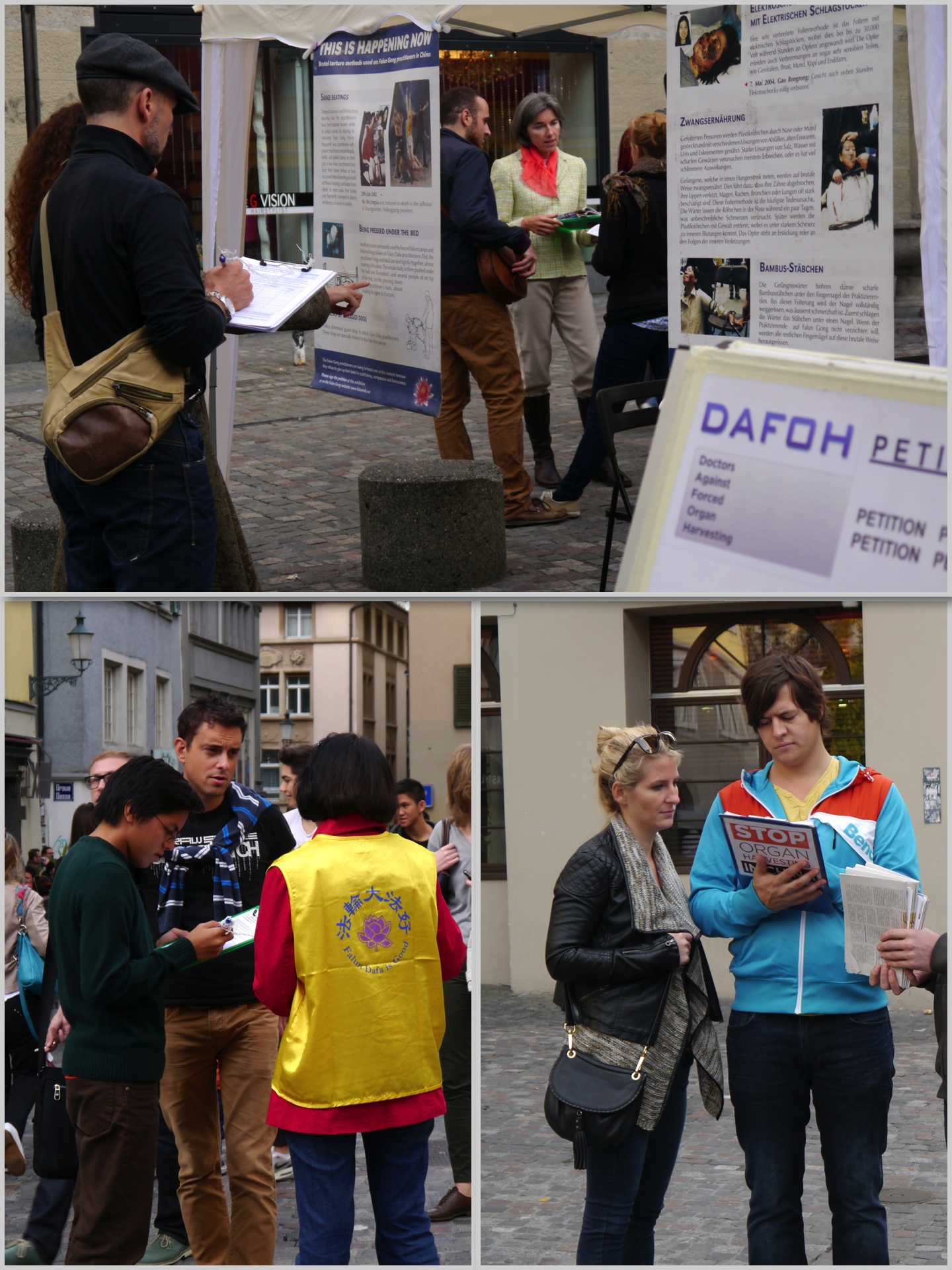 【明慧网二零一三年十月二十九日】二零一三年十月二十七日,法轮功学员再次来到苏黎世老城区的希尔申广场(Hirschenplatz)征集签名,制止中共活摘法轮功学员器官的血腥杀戮。和前几个星期一样,很多路人在读到展板上揭露的中共对法轮功学员的血腥迫害后就主动要求签名。有的则告诉学员,我上周已经签过了。
