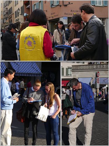 很多路人在签名后感谢法轮功学员的付出,并祝愿法轮功学员能够获得更多的签名,早日制止中共的迫害。在瑞士首都伯尔尼也有多次征签活动。
