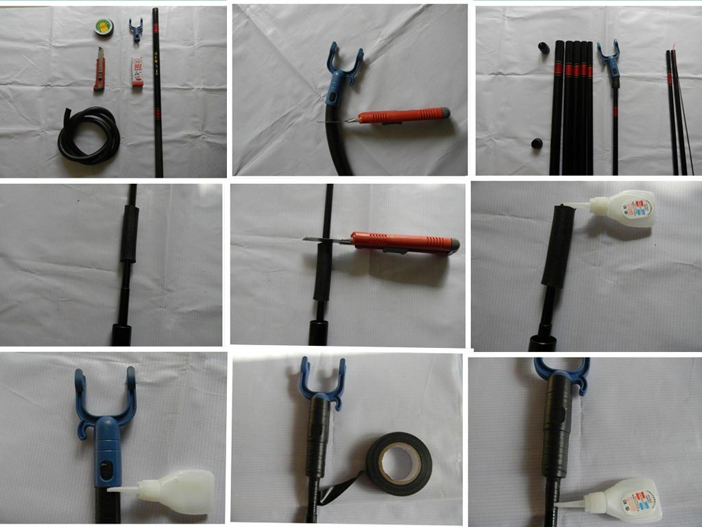 【明慧网二零一三年十月三十日】需要准备的材料:如图所示(左上角图)绝缘防水胶带,切割小刀,502胶水,厚壁胶皮管(内径细外径粗),挑衣杆前端的插头,短节钓鱼竿(就是所有节数收起后长度在60厘米左右的鱼竿,在渔具店选最便宜的大约30元左右,伸开长度为5.4米、6.3米、7.2米的都行)。以上材料除钓鱼竿在渔具店有售外,其余的在卖杂货的地方可以买到。