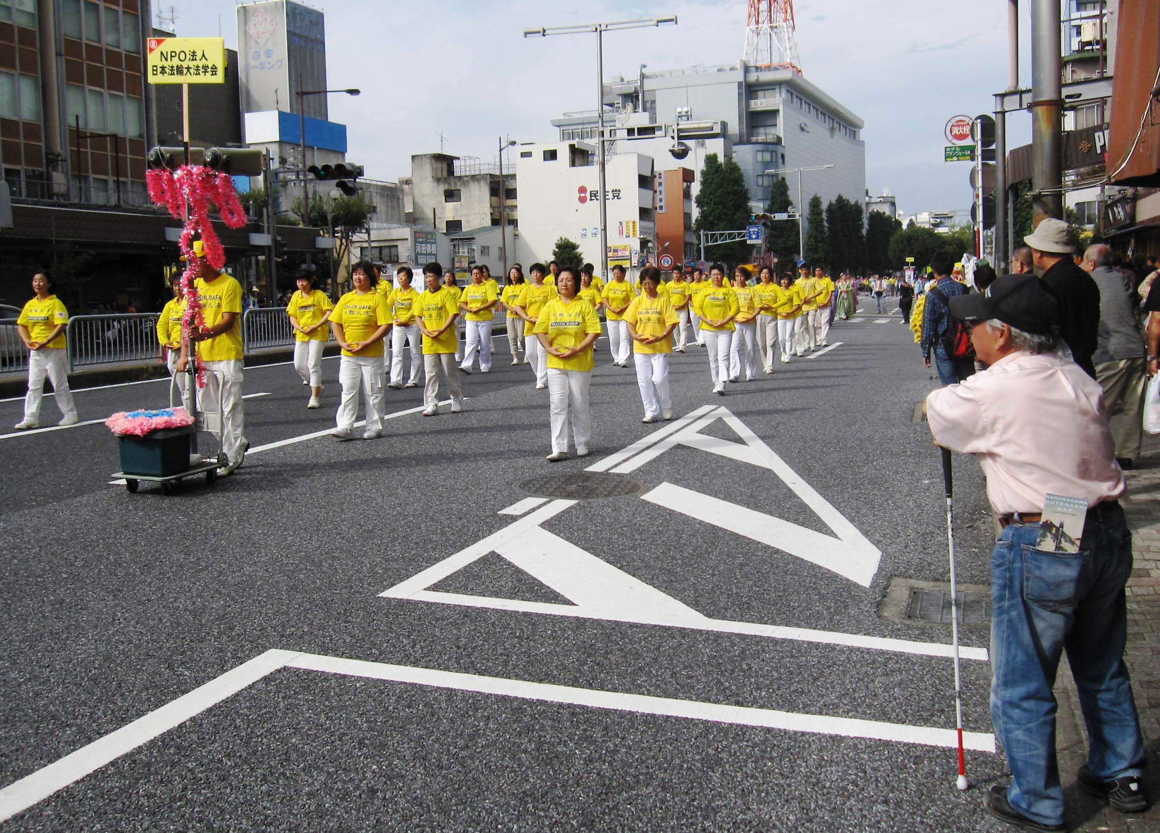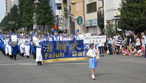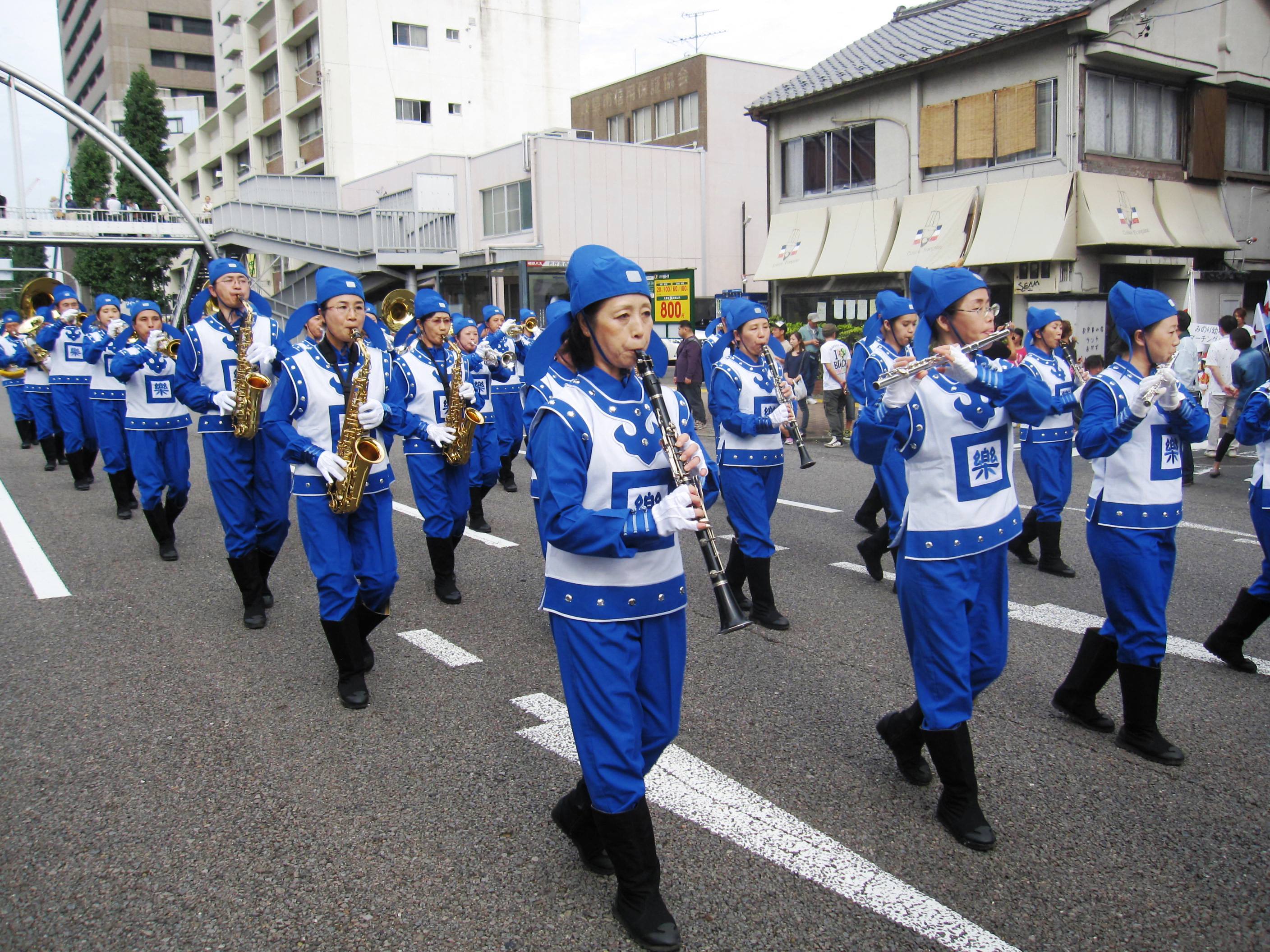 大游行在市区最繁华的金华桥大街上举行。岐阜信长节共有两天的活动。法轮功学员参加了第一天的活动。这一天的大游行有十九个团体参加。法轮功学员出场的队伍包括法轮大法天国乐团,炼功队,仙女队和舞狮子表演。天国乐团的演奏雄壮有力。由三十多名学员组成的炼功队在行進中做了功法展示,许多市民都被法轮大法的美好所感染,不少观众不停的拍照。