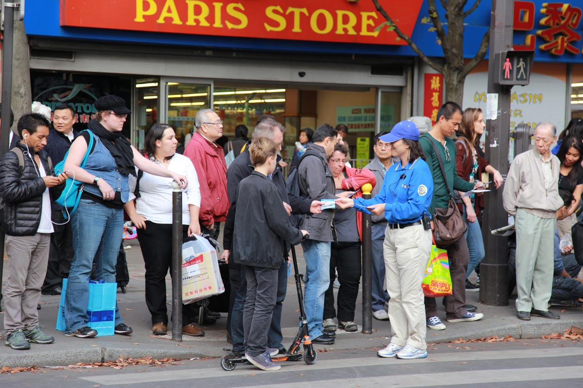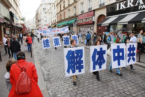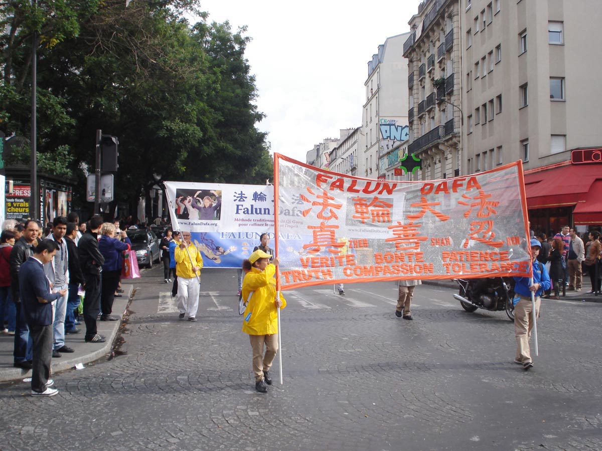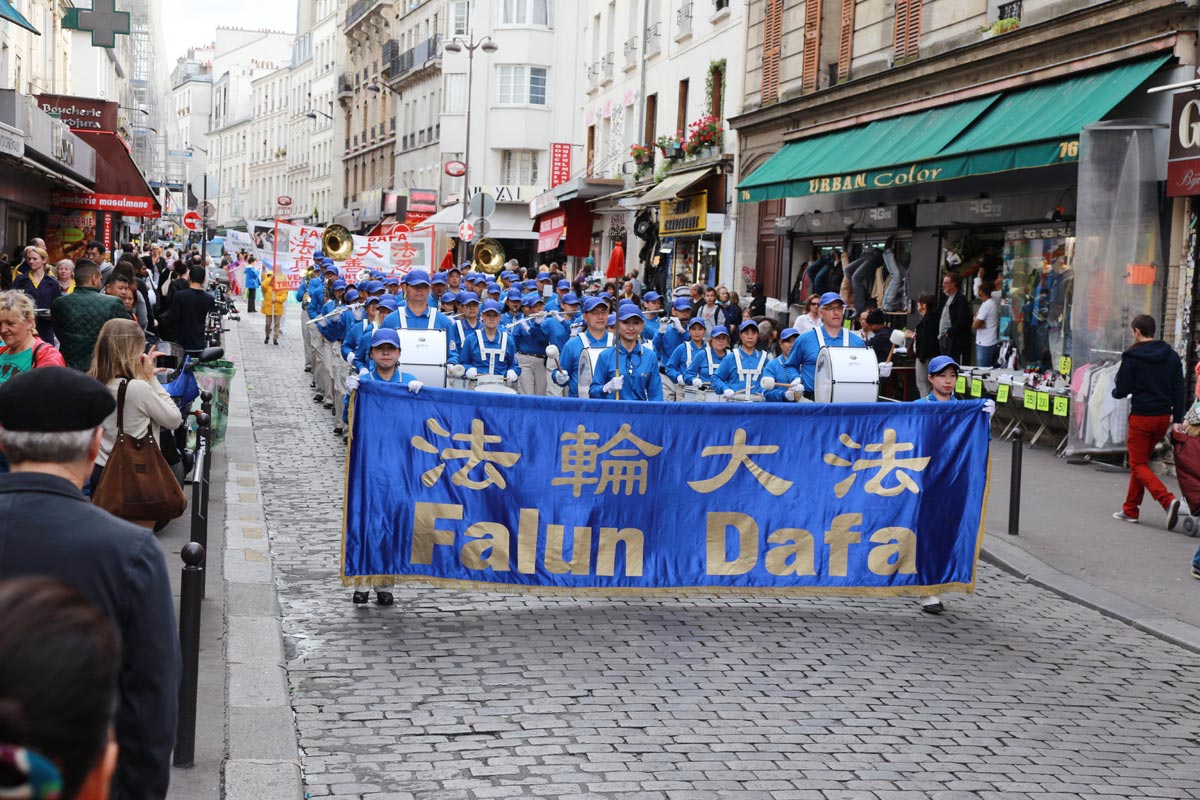 来自德国、英国、比利时、瑞士、西班牙、荷兰、瑞典、芬兰的部份大法弟子参加了这次的活动。游行队伍从华人众多的美丽城出发,经过共和国广场,三区,中国城十三区。天国乐团所到之处吸引了众多的人群驻足观看。游行队伍中的横幅和标语,高音喇叭的中法文广播,都在将真相传递,人们纷纷拿出手机拍摄和录像。