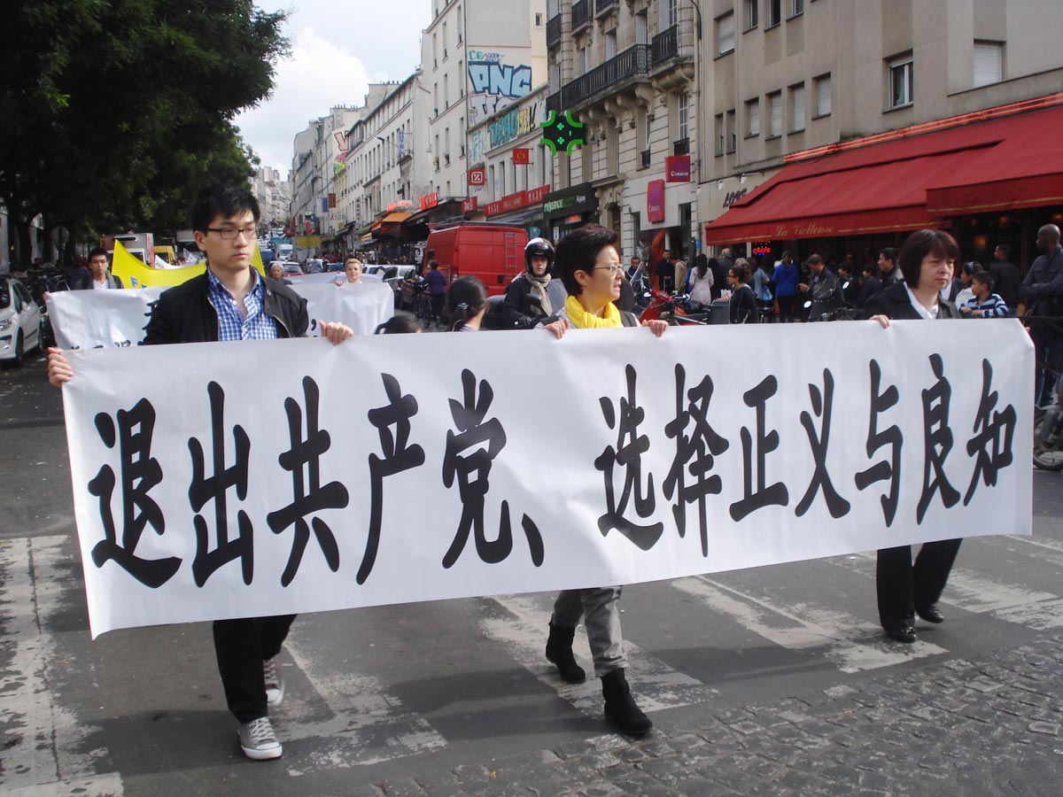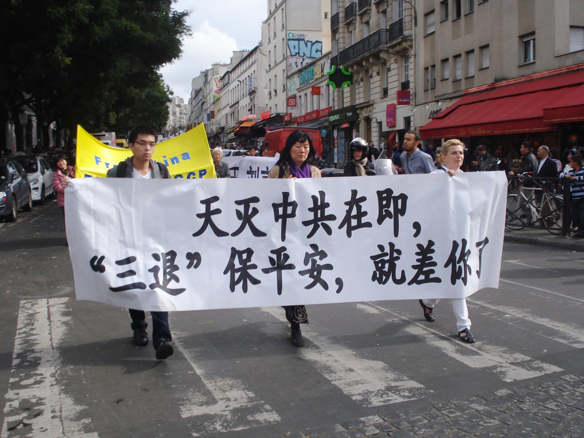 一个在巴黎生活了四十年的老华侨看到游行队伍,非常高兴,他说:“你们做得好。上天有灵,××党有垮台的那一天,我能看到这一天。加油,让它早一点垮台,我支持你们!”