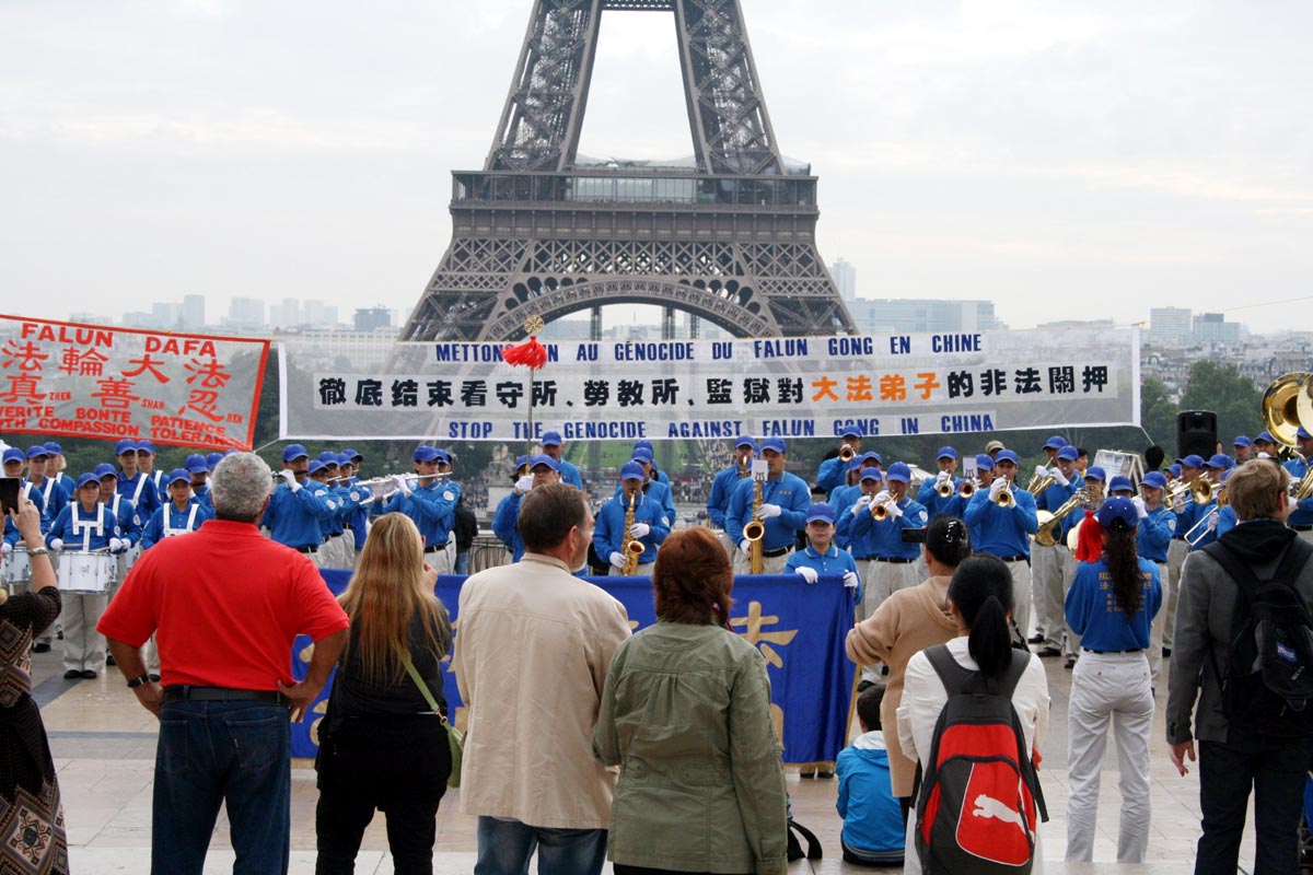 欧洲部份法轮功学员在巴黎铁塔前集会,展现法轮功的美好,并揭露中共活摘器官等种种罪行。