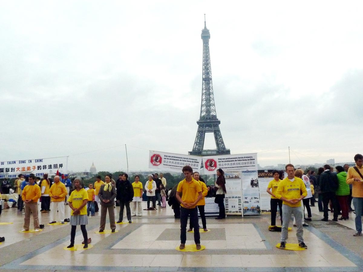 【明慧网二零一三年十月九日】二零一三年十月六日,来自欧洲八个国家的部份法轮功学员,汇聚在巴黎的埃菲尔铁塔正对面的人权广场(place du Trocadéro)上,在主持人英语和法语的介绍中,演示法轮功功法,展示法轮大法的美好。同时,医生反对活摘器官协会(DAFOH)的代表向来自世界各地的游客讲述中共活体摘取法轮功学员器官的事实。了解真相的人们纷纷表示支持法轮功学员反迫害