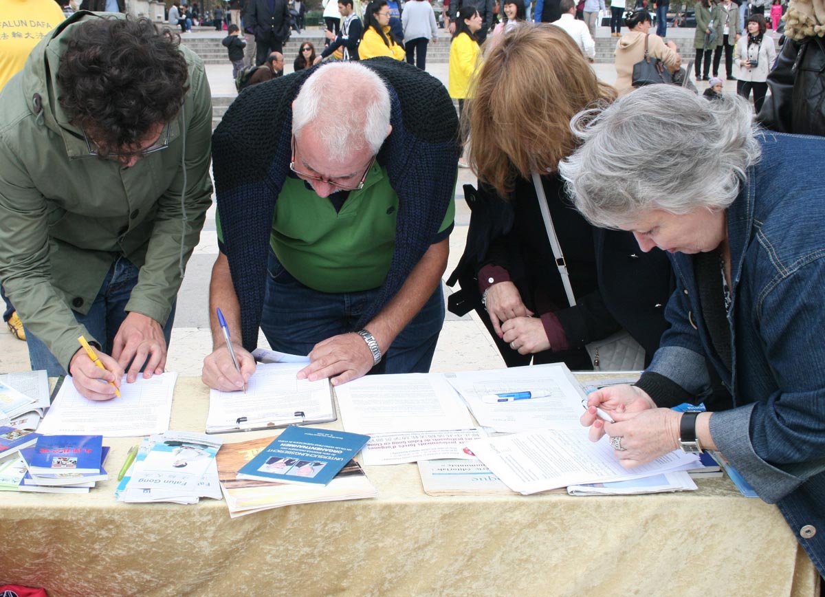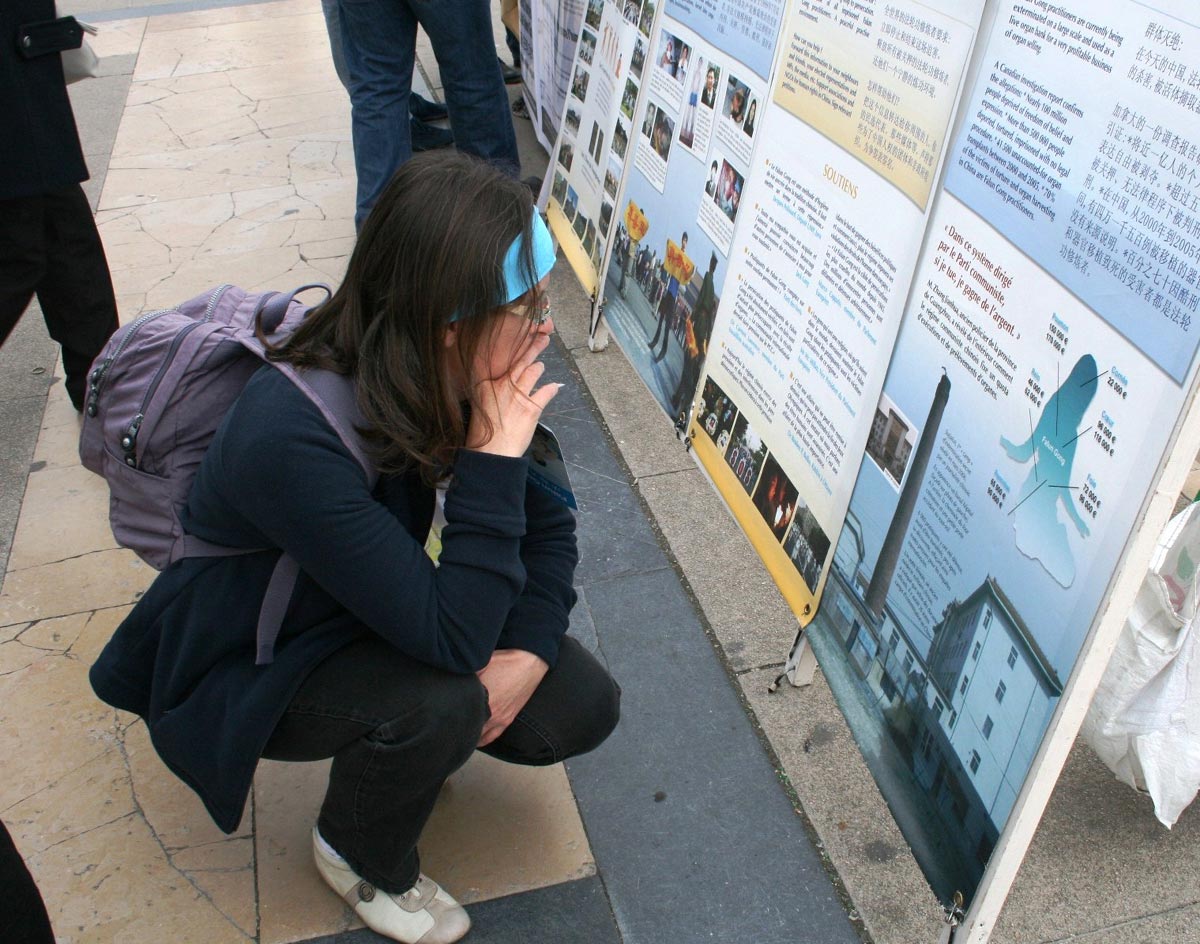 空中以铁塔为背景的法、中、英三种文字的横幅“停止活摘法轮功学员的器官”,“彻底结束看守所、劳教所、监狱对大法弟子的非法关押”赫然眼前。当看到揭露迫害真相的展板,人们震惊了;了解真相的游客主动在反对中共活摘器官的征签簿上签名。