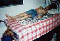 二零零零年,闫思佟在万庄劳教所,警察把他绑在死人床上,手脚都被铐在床上,然后给鼻子上插上塑料管,再用胶布固定在脸上。为了他们灌食方便,管子也不拔。后来闫思佟骨瘦如柴,一米八的个子就剩下几十斤了,因劳教所的卫生条件极差,使他浑身长满了疥疮。他浑身痛痒的钻心,因手脚被死死的绑在床上,一动不能动。闫思佟在极度的痛苦之中常常处于神智不清的昏迷状态,奄奄一息。