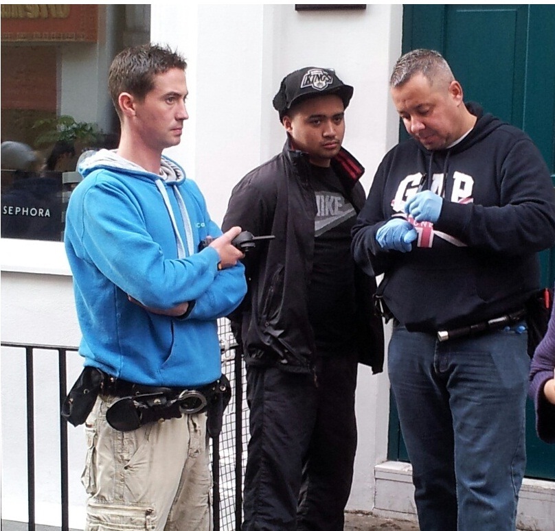 图2:攻击伦敦唐人街法轮功真相点的暴徒阿里•亚历克斯•奥尔蒂斯(中间着黑衣者)被接获报警赶来的便衣警察带上手铐当场逮捕。
