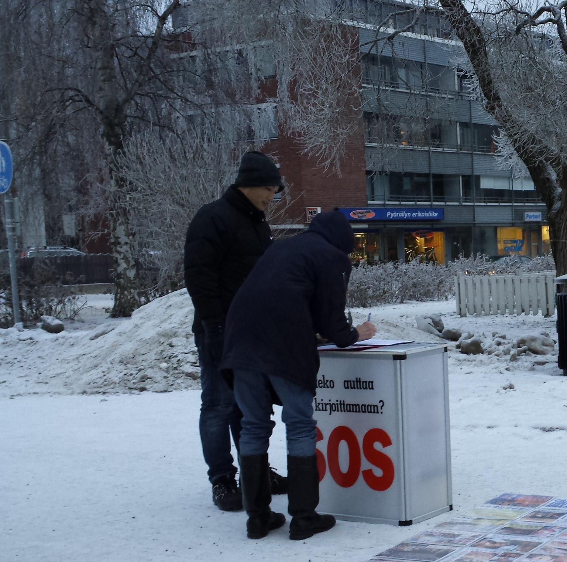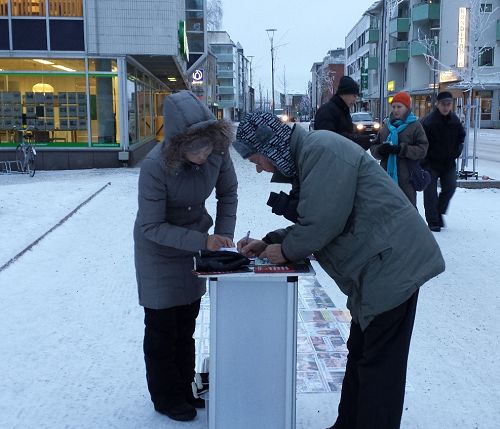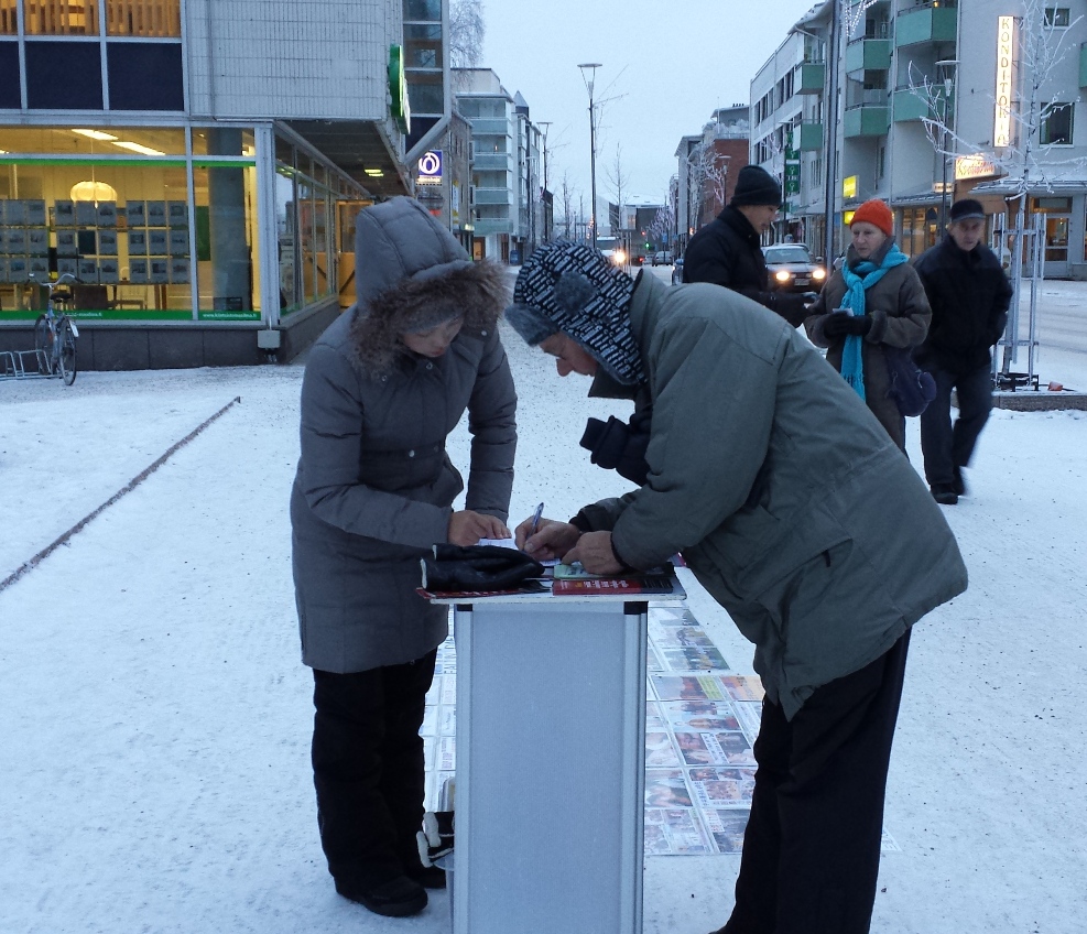 ![]() 冰雪中法轮功学员在芬兰北部持续征签 |