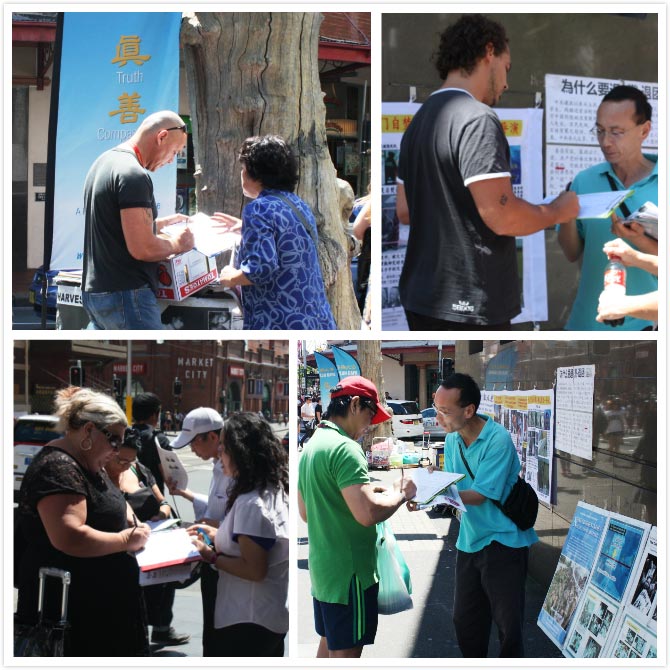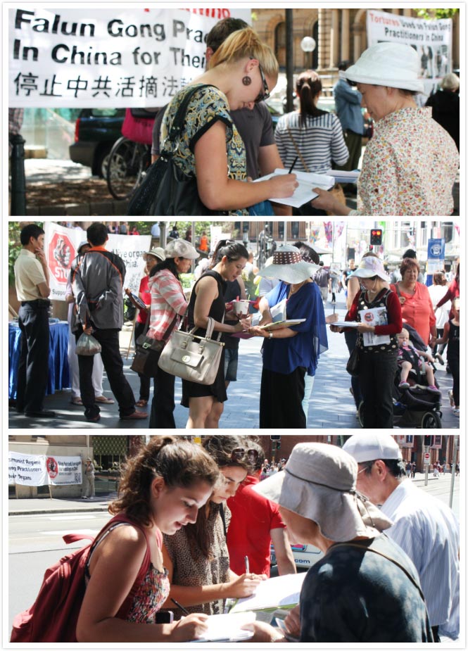 【明慧网二零一三年十一月二十七日】(明慧记者华清悉尼报导)二零一三年十一月二十一日至二十四日,正值“2013年器官移植与获取学会第十二届国际会议(ISODP)”在悉尼会展中心(Sydney Convention Centre)召开期间,悉尼的法轮功学员们在市中心的市政厅门前和中国城附近的悉尼主街上设摊和真相长城,向悉尼各界进一步讲清真相,谴责中共在对法轮功的迫害中所犯下的反人类罪行。要求中国立即、无条件的停止不道德的从死刑犯和所有良心犯身上摘取器官。