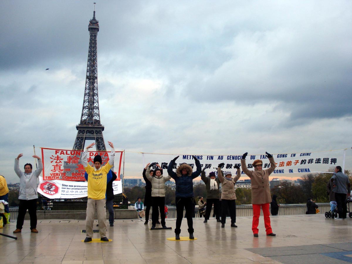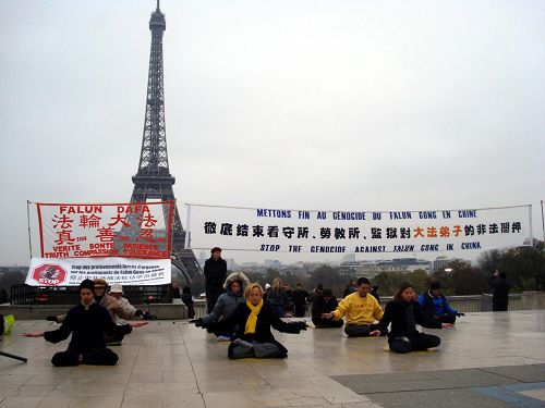 法国部份法轮功学员来到埃菲尔铁塔旁的巴黎人权广场,进行了炼功、讲真相
