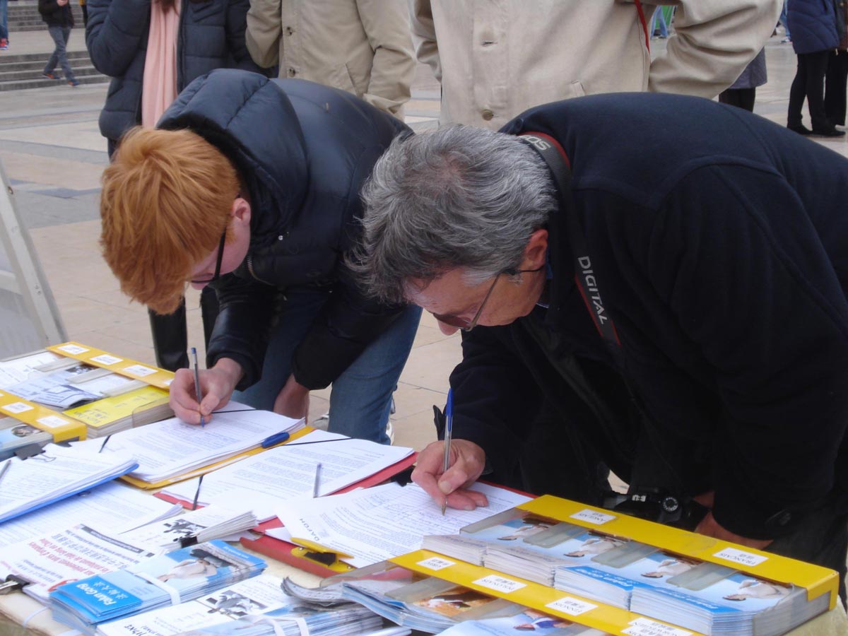 在征签表上签字的有来自刚果的律师,来自孟加拉国的商人,有流亡法国的藏人,更多的是法国各界民众。人们签名后纷纷向法轮功学员表示:“加油”,“我支持你们”;“继续努力!”