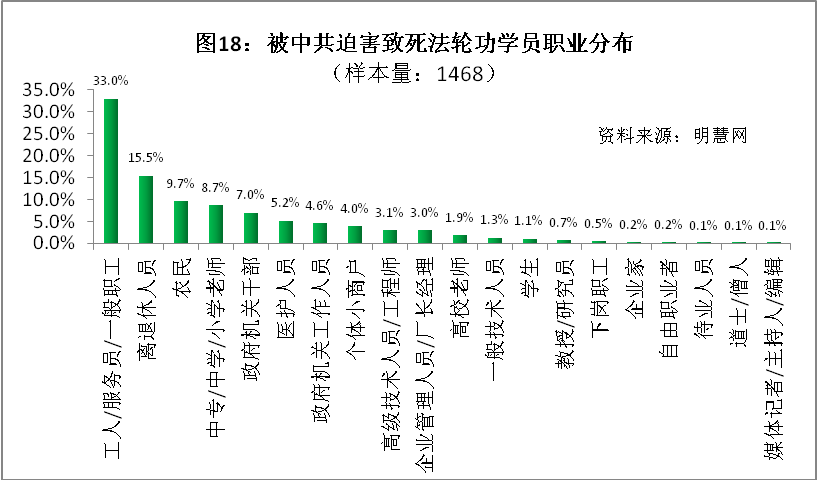 中共对法轮功学员的迫害是全面的,不仅覆盖了中国大陆所有地区,也贯穿了几乎所有行业和所有职业。本报告调查的3653名被迫害致死法轮功学员中,我们统计到1468例有记录到该学员的职业情况,图18统计结果表明,33%为工人/服务员/一般职工,15.5%为离退休人员,9.7%为农民,8.7%为中专/中小学教师,7%为政府机关干部,5.2%为医护人员,4.6%为政府机关工作人员,4%为个体户,还有工程师、个体小商户、企业管理人员、高校教师、学生、教授、企业家、下岗工人、自由职业者、道士、僧人、媒体记者主持人等。可以说涵括了中国所有的职业。