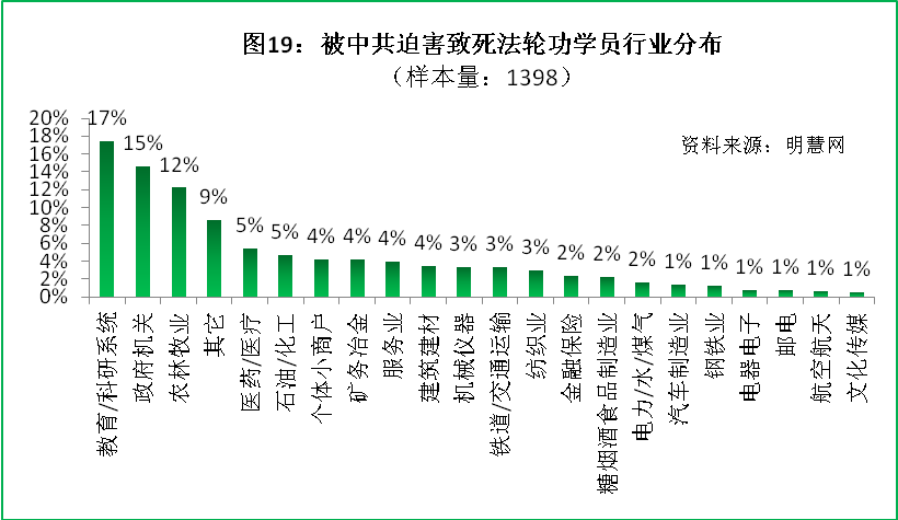 在1468例有职业情况的案例中,我们统计到1398例有记录到该学员的工作单位(图19),其中,17%244名被迫害致死学员出自教育/科研系统,15%204名被迫害致死学员出自政府机关,12%171名被迫害致死法轮功学员出自农林牧业,9%为五金、交电、轻工、陶瓷、塑料制品、工艺品等其它行业,5%医药/医疗行业,5%石油化工,还有个体小商户(4%)、矿务冶金(4%)、服务业(4%)、建筑建材(4%)、机械制造(3%)、铁道/交通运输、纺织、金融保险、糖烟酒副食品、电水煤、汽车制造、钢铁、电器电子、邮电,文化传媒,甚至还有航空航天。可以说几乎涵括了中国所有的行业。