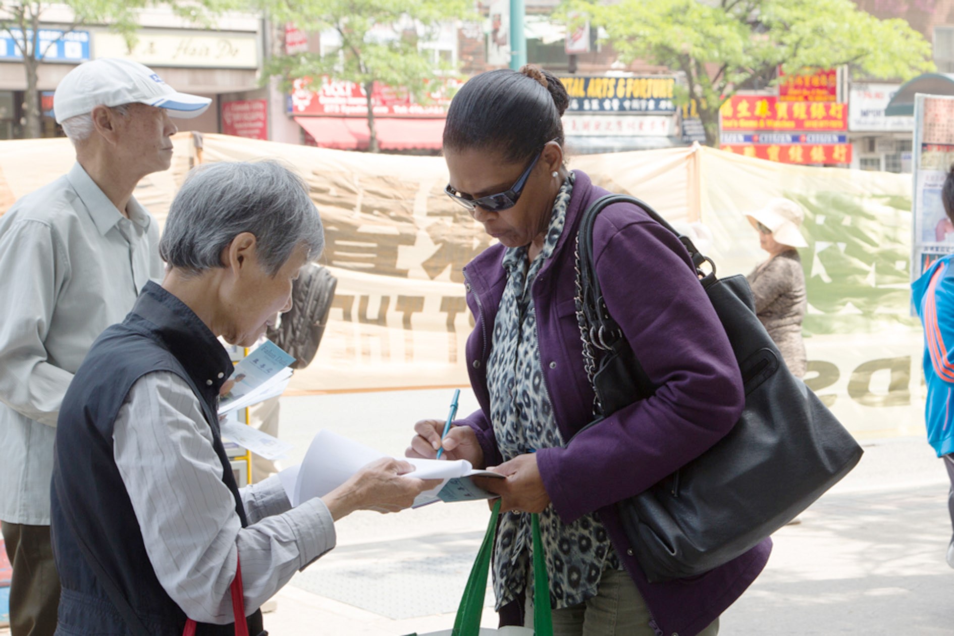 七十五岁的法轮功学员黎家玉通常在公共汽车站征签。她说,她只会讲一句英文:“Please sign(请签名)”。但常有签过名的人帮她向其他人讲解。“有一次,一位白人女士带着两个人签了名。我要去找旁边的另一个人签名时,她马上主动用英文跟那人沟通,结果那人很快签了,那人的朋友也签了。”