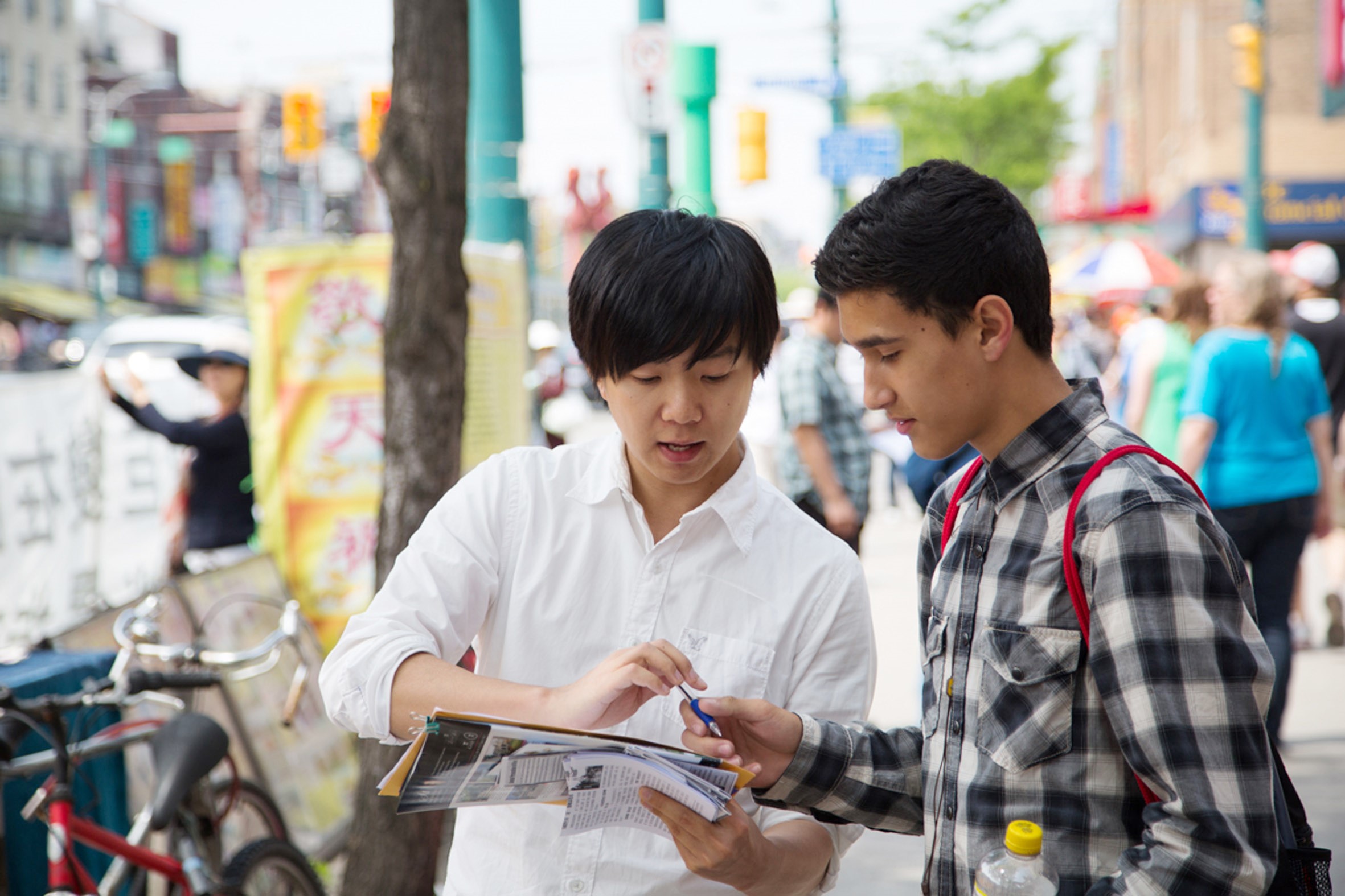 法轮功学员 Lucy主要在唐人街征签。她说,不少人听到“请签名”后,没反应就走过去了。但听到“停止迫害、停止活摘法轮功学员器官时”,马上回来看征签单,脸上露出非常惊讶的表情。他们了解情况后都签了名。