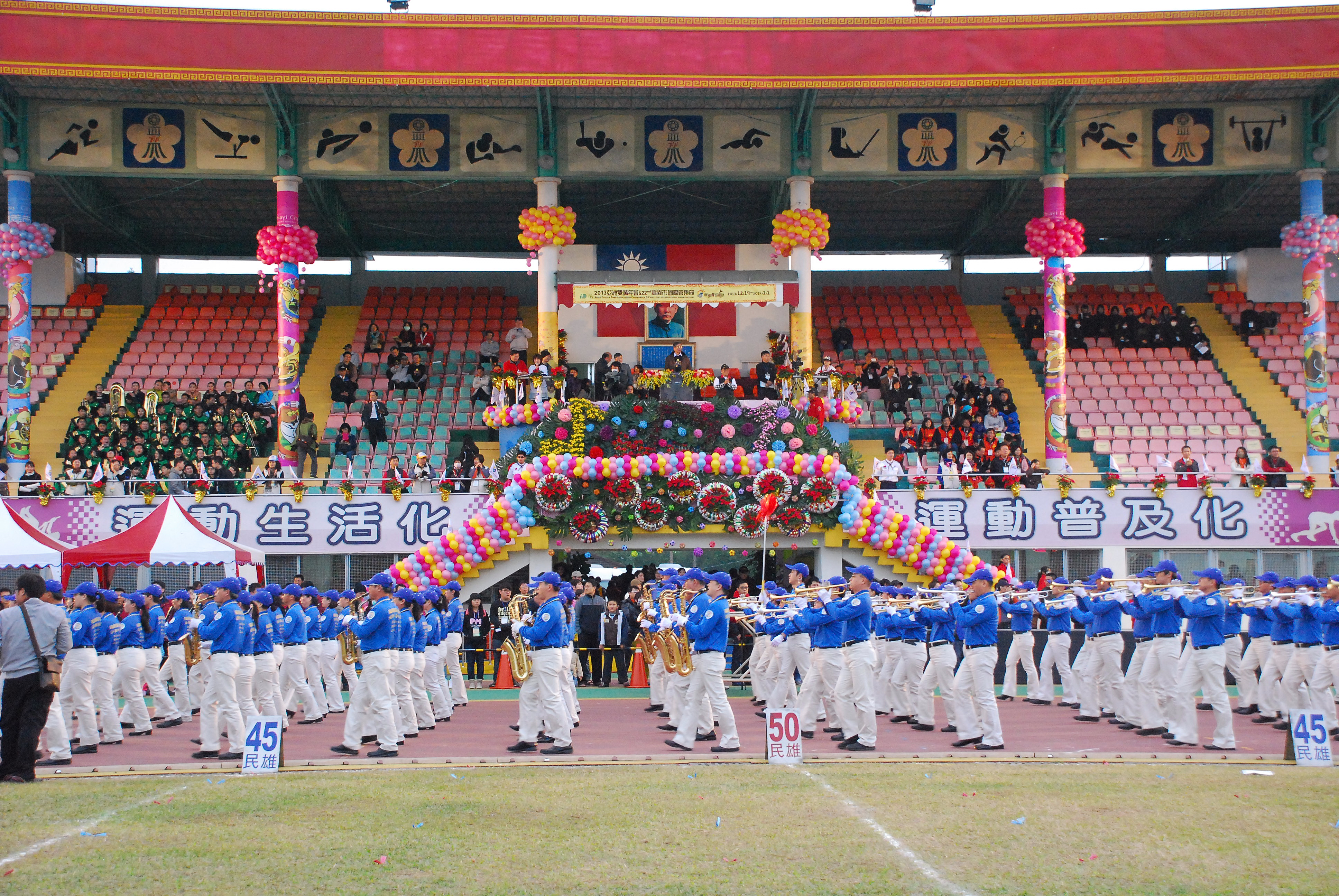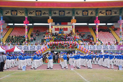 踩街演奏的最后,天国乐团壮盛的队伍进入了嘉义市体育场,经过司令台前时,又引起了全场热烈的欢呼及掌声。