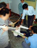 二十四日上午,这一伙恶人打手又来了,里玉书仍不配合,她们将里玉书从床上毒打到地上。杨秋香狠打里玉书的耳光,用脚拼命的踩里玉书的小腿。李丹、王鑫华、邢国辉又用胶带缠捆里玉书。