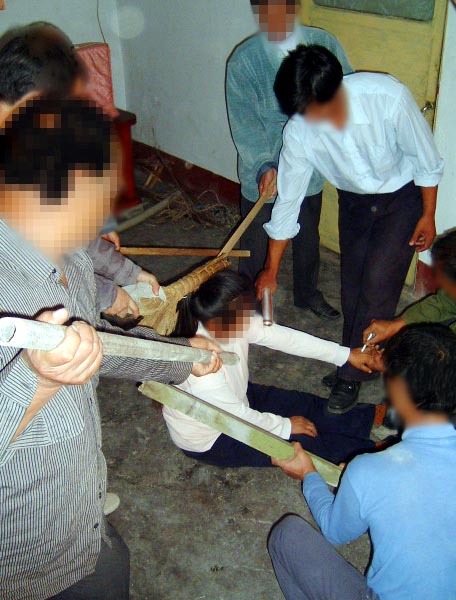 一会儿,包锐等人进来了,她们就把里玉书拖到走廊,里玉书高呼:“法轮大法好”。包锐一伙一边翻里玉书的床铺,一边恶狠狠地说:“把嘴封上!”在她的唆使之下,来了防暴队的恶警,三十岁的大小伙子,对里玉书连踢带打,并用脚狠狠地踩里玉书的身体,用胶带在里玉书的嘴上缠了好几圈,又将里玉书的手背过身后去。