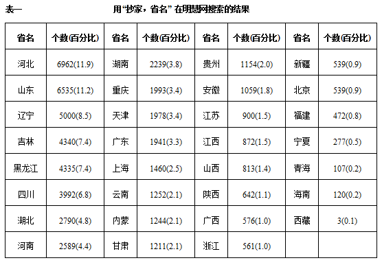 2013年2月13日,笔者用“抄家”、省名在明慧网搜索,得到了表一的结果。有读者会说,可能有的一个事件网上记录可能不止一次。是这样的,但在相同的条件下,因为是比较数据,影响会小一些。有些误差,但总体还是会反映出事物、事件的特点来。这里说明一下,由于北京的特殊性,如1999年7.20后,全国各地法轮功学员都去北京上访护法,回去后有些学员被邪党人员(抢劫)抄家,如果这样搜索,数据失真性大。同样,西藏数据量太小,失真性也大。所以这两个地方数据用“抄家,地名法轮功学员”和“抄家,地名大法弟子”来搜索综合得到。