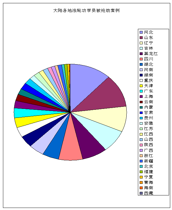 从表一和上图我们可以知道,邪党人员抢劫法轮功学员最严重的地区,首先是河北、山东、辽宁、吉林、黑龙江、四川,其次是湖北、河南、湖南、重庆、天津、广东……,遍及了中国大陆所有的省、直辖市、自治区。