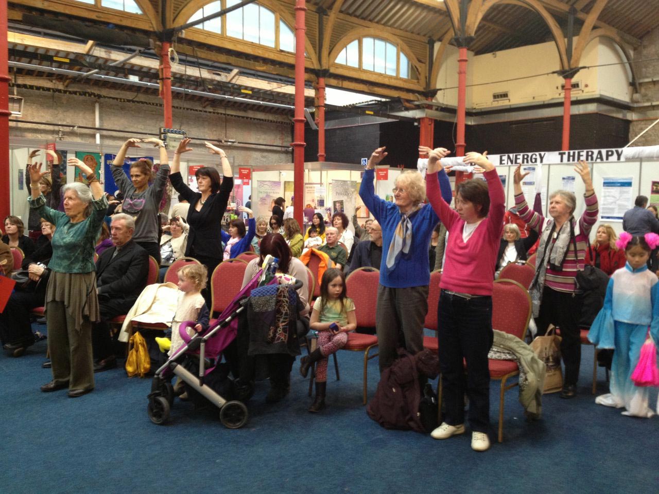 法轮大法学员们也被邀请参加表演。小弟子们表演了“法轮大法好”的扇子舞和“真善忍的好宝宝”两支舞蹈。之后,大法弟子做了功法演示,很多人在位置上就跟着学起来了。小弟子们在做功法演示时,也令很多人惊叹。惊叹她们小小的年级就能够如此安静、祥和的炼功。