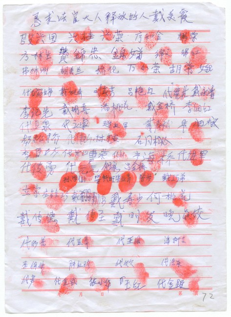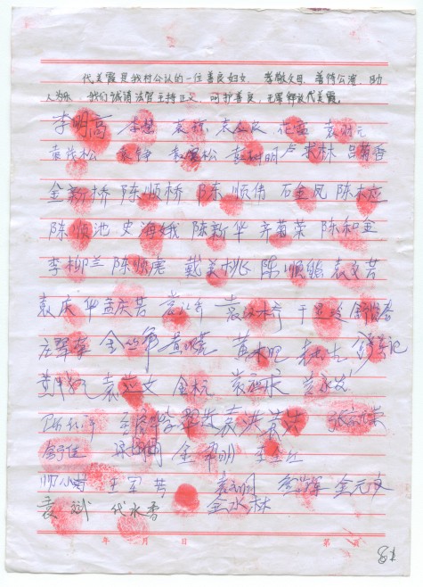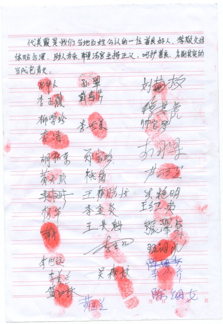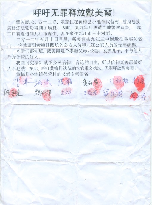 近日,黄梅县当地近三百名民众签名按手印,他们在呼吁书中写道:戴美霞是我们这里的善良村民,孝敬父母,善待公婆,助人为乐。联名要求法官主持正义,呵护善良,无罪释放法轮功学员戴美霞!