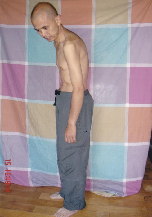 这样戴上刑具后,站立时腰和腿成九十度,一直弯着,上厕所无法解裤子,睡觉腿脚不能伸直,脚镣的铁链有手指头粗,生着锈,两腿间的距离只有一尺长,手铐是老式的“板铐”,两手之间只有一寸多点距离,睡觉时只能极痛苦的蜷缩下去,不一会儿,一侧的手脚就被勒得红肿,又得换到另一侧,所以一会儿起来,一会儿躺下,而起来、躺下只能靠腹肌用力,就象做仰卧起坐,所以一晚上就这样不停的做“仰卧起坐”,无法入睡。不到二十四小时,我的两脚后脚颈处就被磨破了,生着锈的脚链又直接摩擦着破了皮处的肉,不久白白的脚筋磨得露了出来,每挪一步路都疼得钻心。
