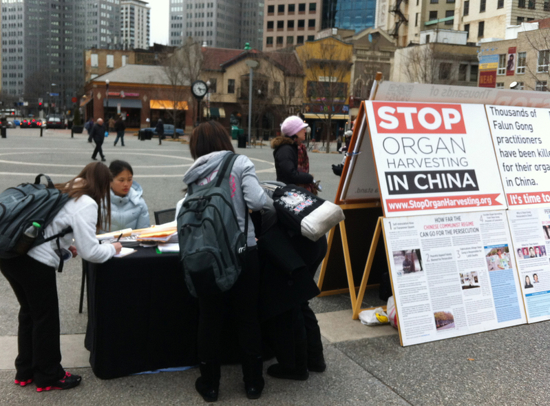 在匹兹堡市中心,多辆载有“制止中共活摘器官”巨幅展板的车辆在主干道上巡行;在最繁华的市集广场和匹兹堡大学医疗中心前,义工们不畏风雪,连日打出“制止发生在中国的群体灭绝”横幅和展板,派发资料,征集请愿签名;在匹兹堡大学举行的“器官移植在中国被滥用”研讨会和在卡内基•梅隆大学的获奖影片《自由中国》放映会,也吸引了众多专家学者和师生的热烈参与、互动。