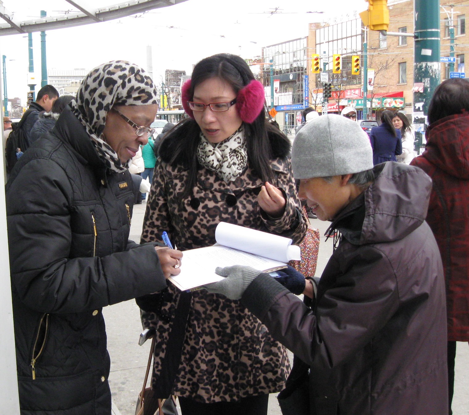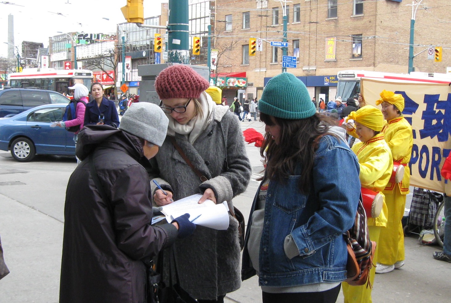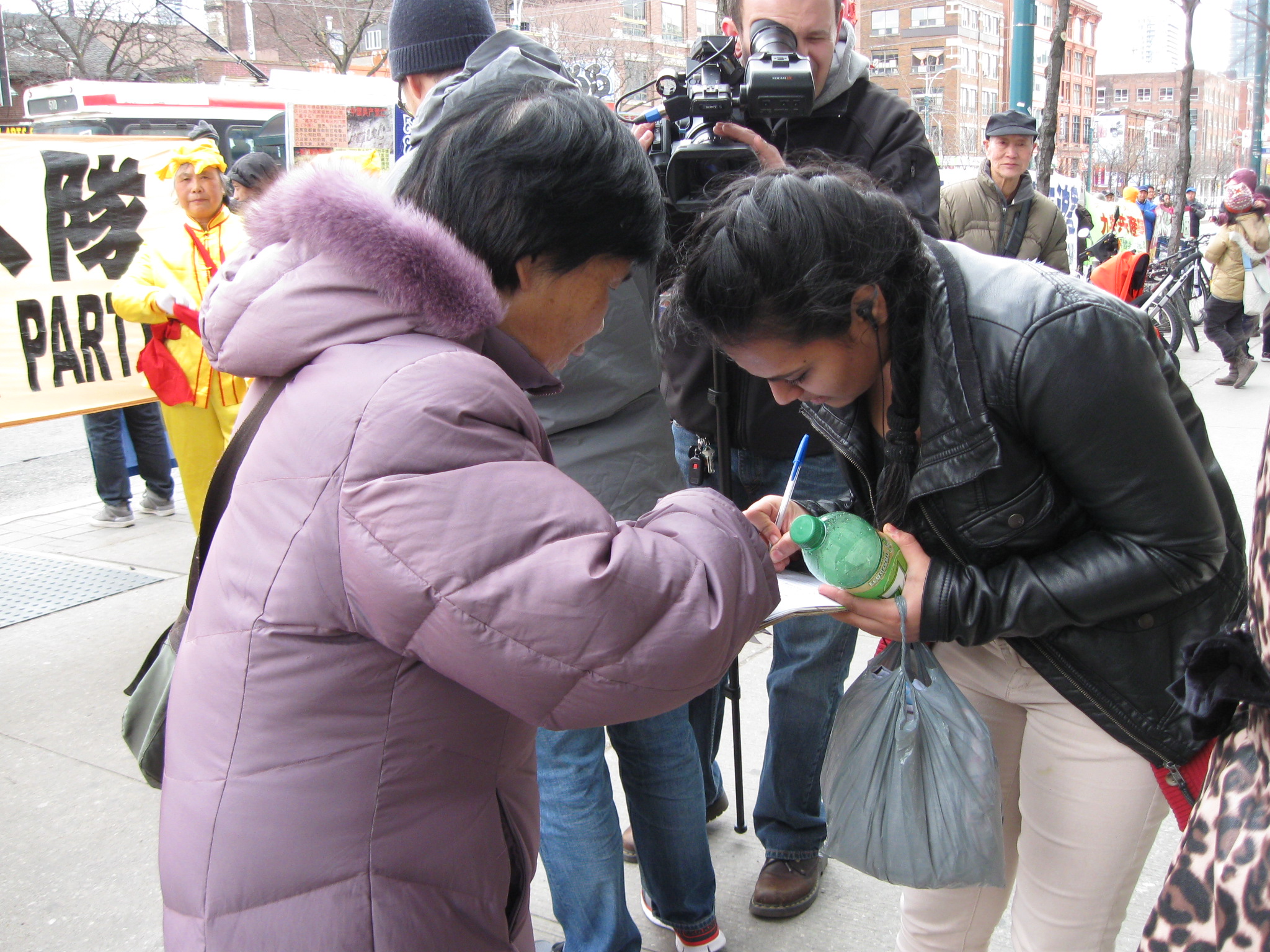 天气很冷,天天在街头上征签,很辛苦,王洪敏说:“这点辛苦,相比于中国大陆的法轮功学员,什么都不是。他们每发一张传单讲真相,都是冒着生命危险在做,有的被迫害致死,有的失踪,有的被活体摘取器官。但是,十几年了,也没被压倒。我们征签的目的就是要停止迫害,十几年的诉求只是要停止迫害。”