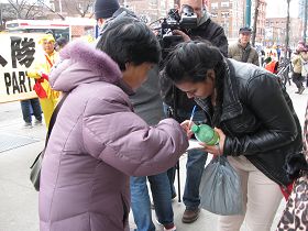 来自大陆的音乐教师王影在现场微笑着向过往路人讲真相。王影曾在一九八八年患心脏病,饱受疾病折磨,九死一生。曾经走遍大大小小的医院,都没有治好,后来炼法轮功以后,神奇般的好了。九九年中共开始镇压后,她被多次关押、劳教,经受魔鬼般酷刑迫害。曾在臭名昭著的吉林省黑嘴子劳教所关押两年。她说前不久明慧网报道的中共监狱、劳教所对女性法轮功学员的迫害,她都经历过。