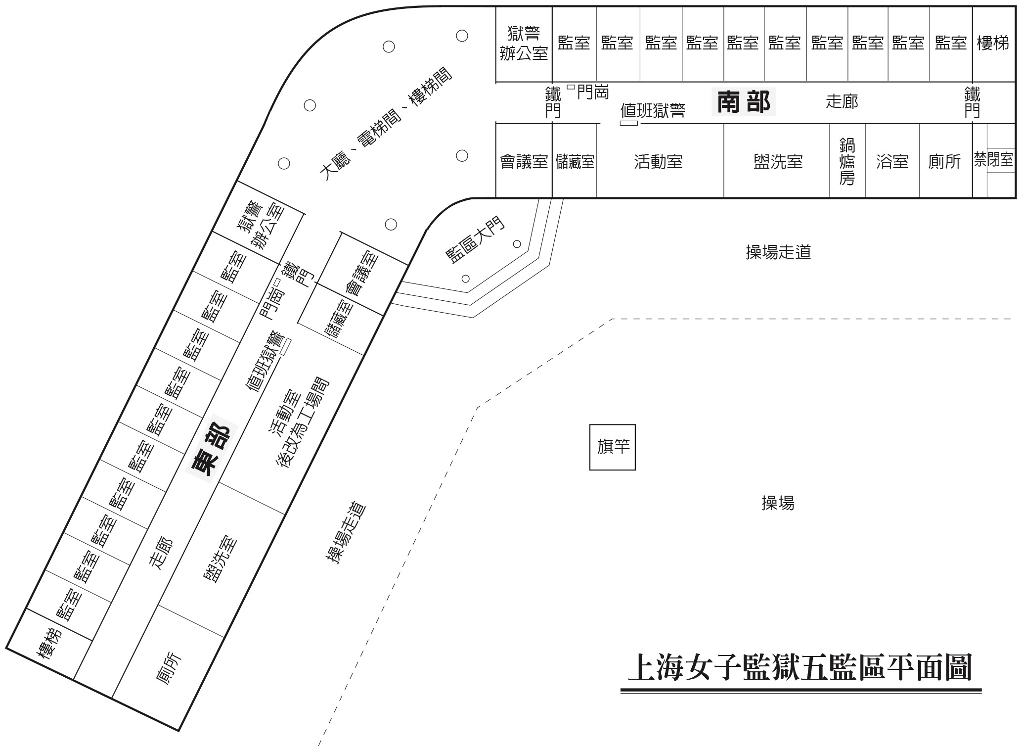 上海女子监狱五监区是专门为迫害法轮功修炼者而成立的监区,分为南部(一分监区)和东部(二分监区)两个分监区,南部主要用作关押坚定的大法弟子和狱警认为“不稳定”的学员,东部主要是以奴工迫害为主。五监区的很多设施都与迫害直接有关,详见五监区平面图和监室平面图。