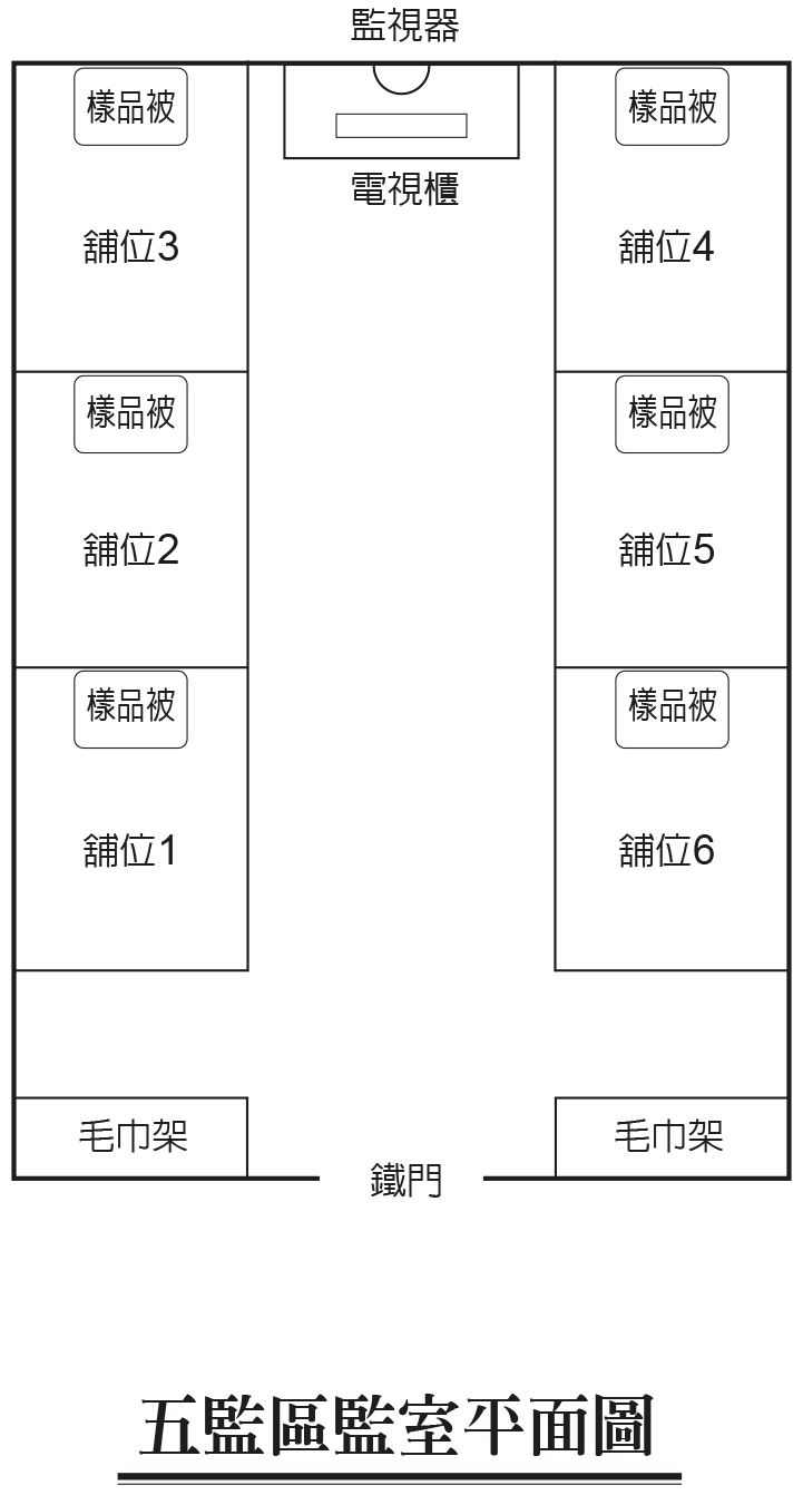 电视机上方是一个三百六十度全方位彩色监视器,用于监视每个人的言行,特别是规定法轮功学员睡在铺位二和五,便于监视器监视。详见监室平面图。