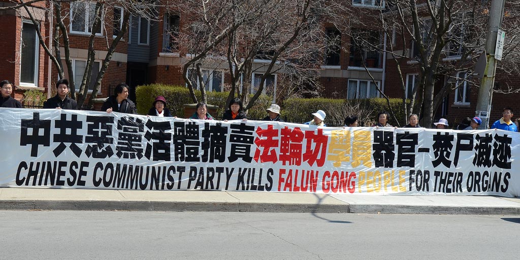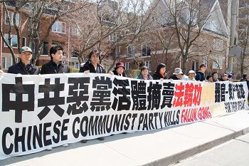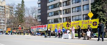 下午四点至六点,学员们在领馆附近的大学街(University)和布鲁街(Bloor)路口拉起了横幅,筑起真相长城给路人讲真相和“制止中共活体摘取法轮功学员器官”的征签活动。晚上八点至十点回到中领馆前进行烛光悼念。