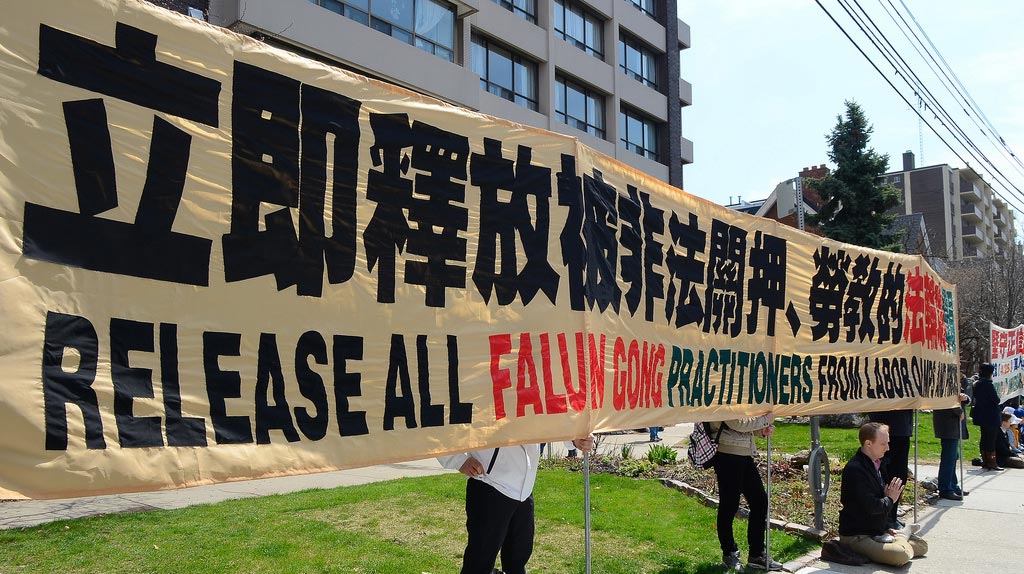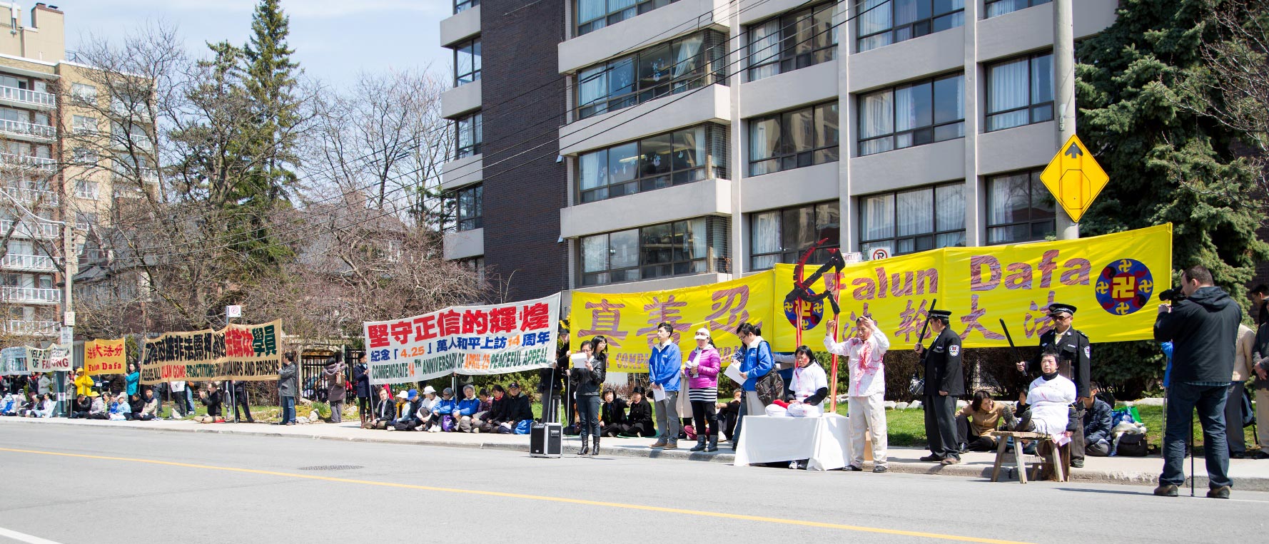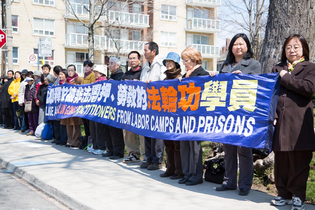 走过十四年寒暑,历经中共非法的残酷迫害,法轮功学员平和依旧,二零一三年四月二十五日中午,数百名多伦多法轮功学员在驻加拿大多伦多中国领事馆前集会,再次以平和的形式、酷刑展示,向世人讲真相,揭露中共对法轮功的迫害,唤醒良知。