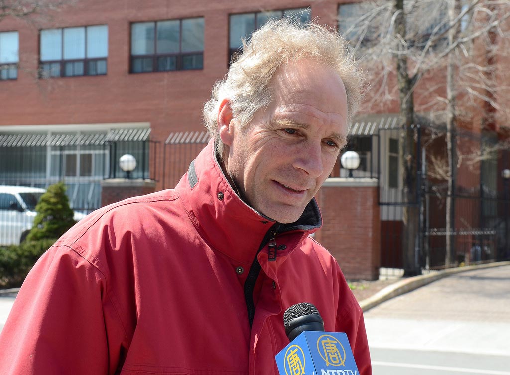 ![]() Steve Engholl 住在中领馆附近的居民区,十几年来他一直都能看到法轮功学员在中领馆前的和平抗议,今天他特意赶来支持这个活动。 |