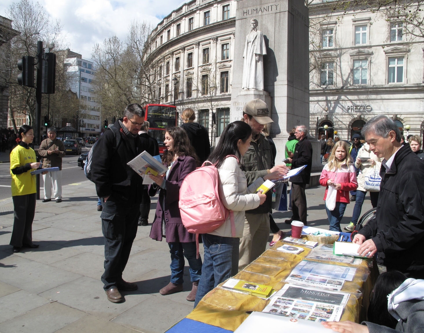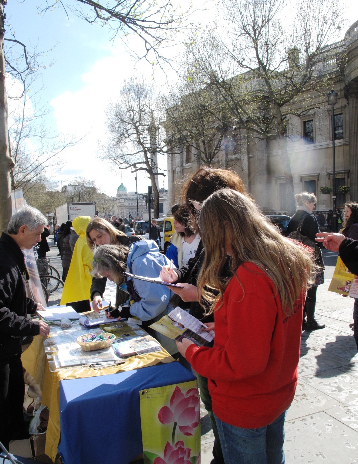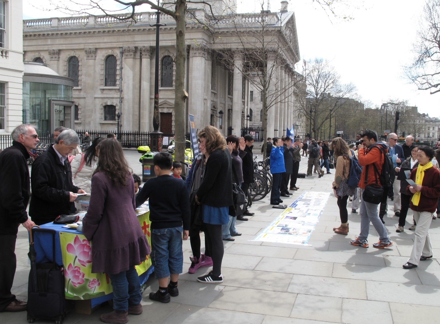 在一天的活动中,当天途经伦敦中心圣马丁广场的英国民众和来自世界各地的游客纷纷停下脚步认真了解法轮功真相,有许多民众驻足观看法轮功真相展板和信息,看到有关中共摘取法轮功学员器官这一罪恶的信息后,人们毫不犹豫地在要求呼吁联合国开展有关独立调查的征签表上签名,一天下来收集的签名约五百个。