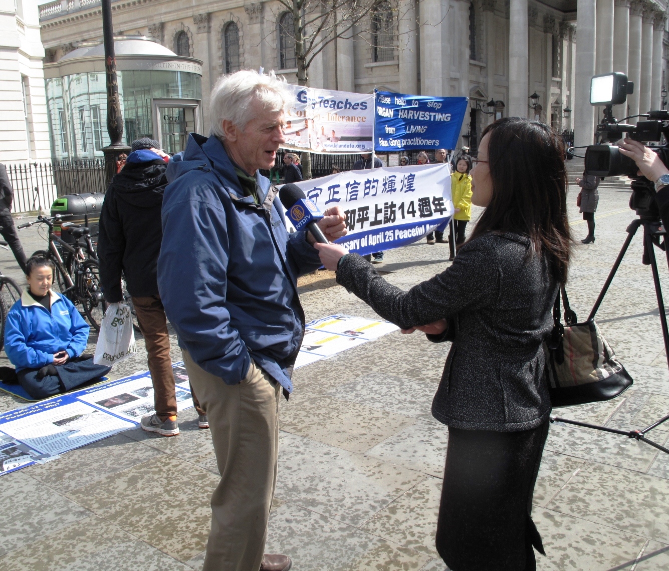 正在伦敦短暂停留的加拿大前亚太司司长、前资深国会议员、《血腥的器官摘取(Bloody Harvest)》一书的联合作者大卫•乔高(David Kilgour)也来到当天活动现场,他表示非常赞叹法轮功学员多年来坚持不懈讲真相和反迫害的努力,呼吁中共停止迫害法轮功,立即停止强行摘取器官这一反人类罪行,他说:“所说的(中共)反人类罪行就是指杀害法轮功学员和良心犯,这些人没有做任何不好的事,但他们的器官却被获取贩卖,这是非常、非常可怕的反人道罪行。”