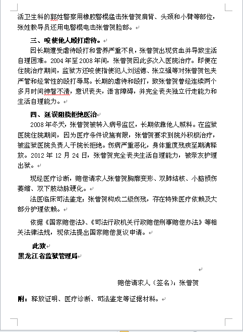 张普贺出狱后,为揭露佳木斯监狱对其十年残酷迫害,维护自己的权益,聘请北京律师就自己被佳木斯监狱迫害致残一案申请国家赔偿。律师按法律程序于二零一二年十二月二十七日向佳木斯监狱狱政科递交了《国家赔偿申请书》等相关法律文书,由于狱政科刘科长不在,律师将法律文书留在那里,并在一周内用特快专递将上述法律文书寄给佳木斯监狱狱政科长和监狱长各一份。