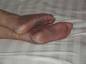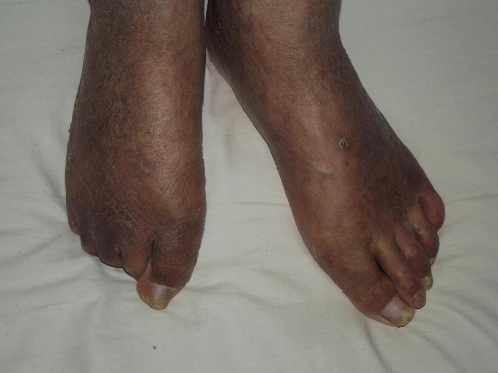 二零零八年一月,张普贺是扶着墙走进医院的,住院时人是清醒的,平时只需一人轻轻搀扶就可行走,没有语言障碍,不知在住院期间使用什么药物,致使他双下肢出现严重病变,双下肢自大腿根以下浮肿,两腿不能弯曲,十天左右消肿后,膝以下青紫,脚变黑色。从此不能站立不能行走,出现严重语言障碍,吐字不清,语无伦次,完全失去生活自理能力,中间还出现约两个月的昏迷状态,几乎失去意识,理智不清。