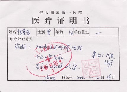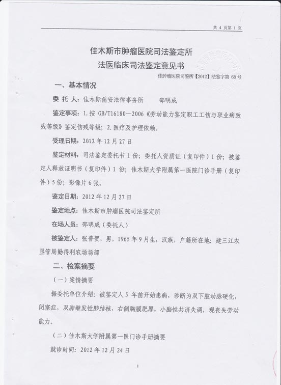 二零一三年一月十五日下午,两位北京律师去黑龙江省合江地区检察院递交《关于要求对张普贺在佳木斯监狱遭受虐待殴打伤残案的相关责任人依法追究刑事责任的控告书》,依法控告佳木斯监狱对张普贺实施警棍电击、非法禁闭殴打虐待和教唆监狱犯人实施殴打虐待的相关责任人员;控告佳木斯监狱在张普贺伤残生病期间既不进行医治又拒不依法办理保外就医手续的相关责任人员。因检察长不在,一女办事员张立接待了两位律师并收下了材料,说两个月内答复。