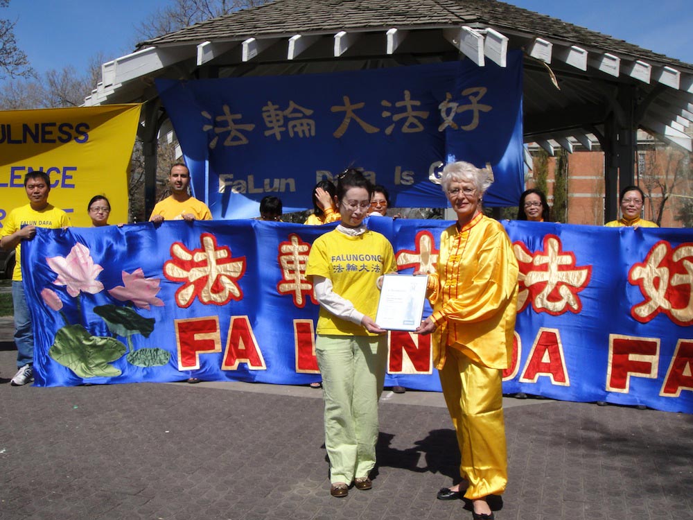 仪式最后,主持人宣读了埃德蒙顿市市长和全体市议员给法轮大法的褒奖,宣布五月为埃德蒙顿法轮大法月。