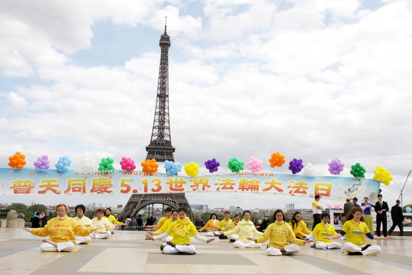 五月十二日星期日,法国法轮功学员来到巴黎著名的人权广场,共同庆祝世界法轮大法日和法轮功创始人李洪志先生的六十二岁华诞。现场拉起了用彩色气球装扮的巨型条幅“普天同庆5.13世界法轮大法日”,分外耀眼。庆祝活动内容丰富多彩:学员们在现场用舞蹈和音乐表达了欢庆节日的喜悦心情,还现场教授游客们叠莲花。最吸引游客的是学员们现场演示五套功法,人们不由得驻足观看。现场周围还摆满了介绍法轮大法洪传世界五大洲盛况的展板,揭露中共酷刑迫害法轮功学员的多语种图片展板,还有多语种介绍法轮功的小册子。学员们在现场通过麦克风用法文、英文和中文不停地向游客介绍法轮大法,呼吁游客在“制止中共迫害法轮功请愿书”上签名。