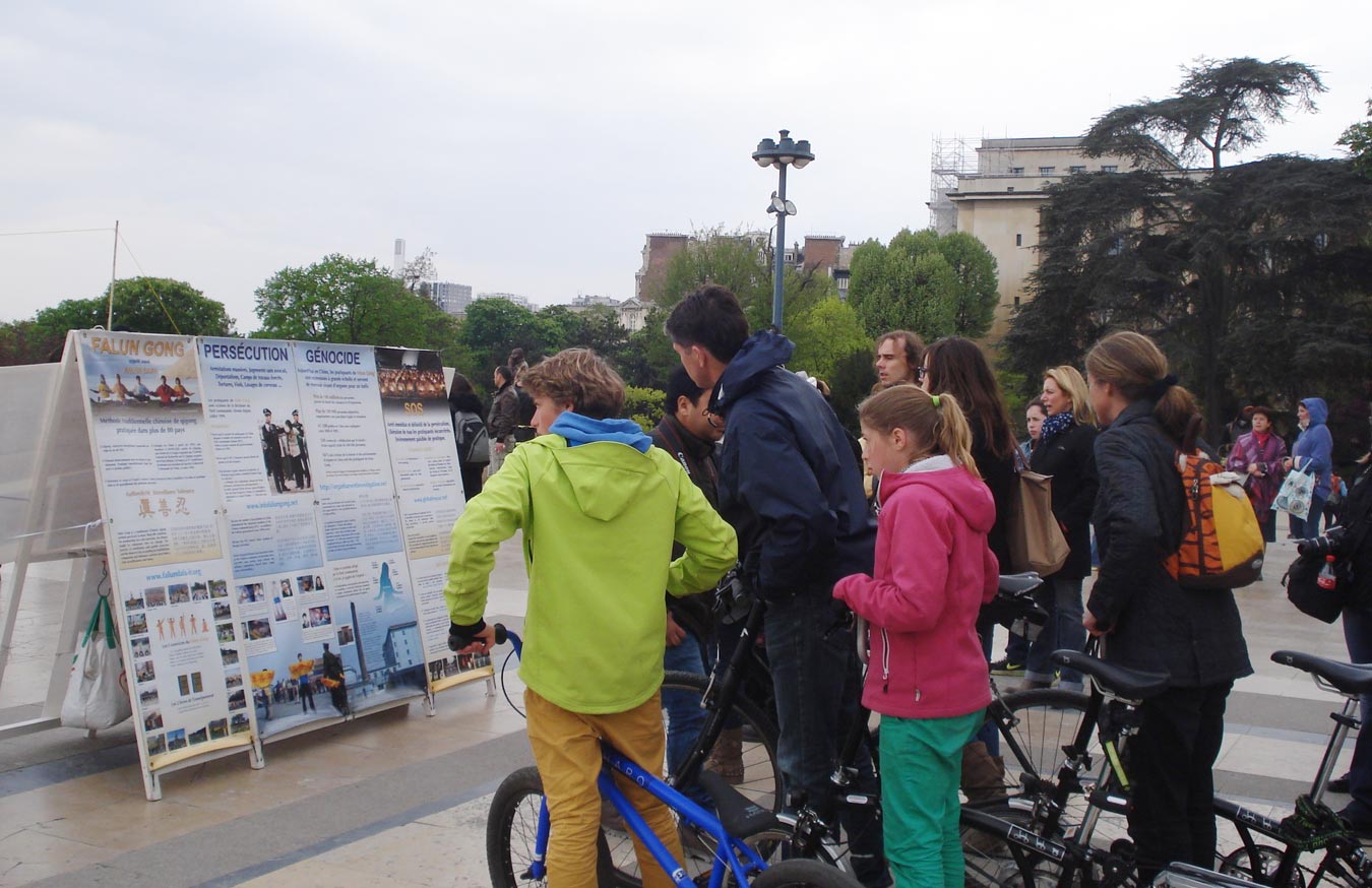法国的法轮功学员从二零零零年五月十三日开始,每年都会在象征“人权、自由、平等”的巴黎人权广场庆祝法轮大法洪传世界和开展各种讲真相的活动,今年已经走入第十四个年头,数不清的中外游客因此了解了法轮功,支持法轮功学员和平、理性的反迫害,越来越多的中国游客开始走出中共制造的恐怖,在巴黎的人权广场了解到真相,也有不少人因此走入法轮大法的修炼行列中。