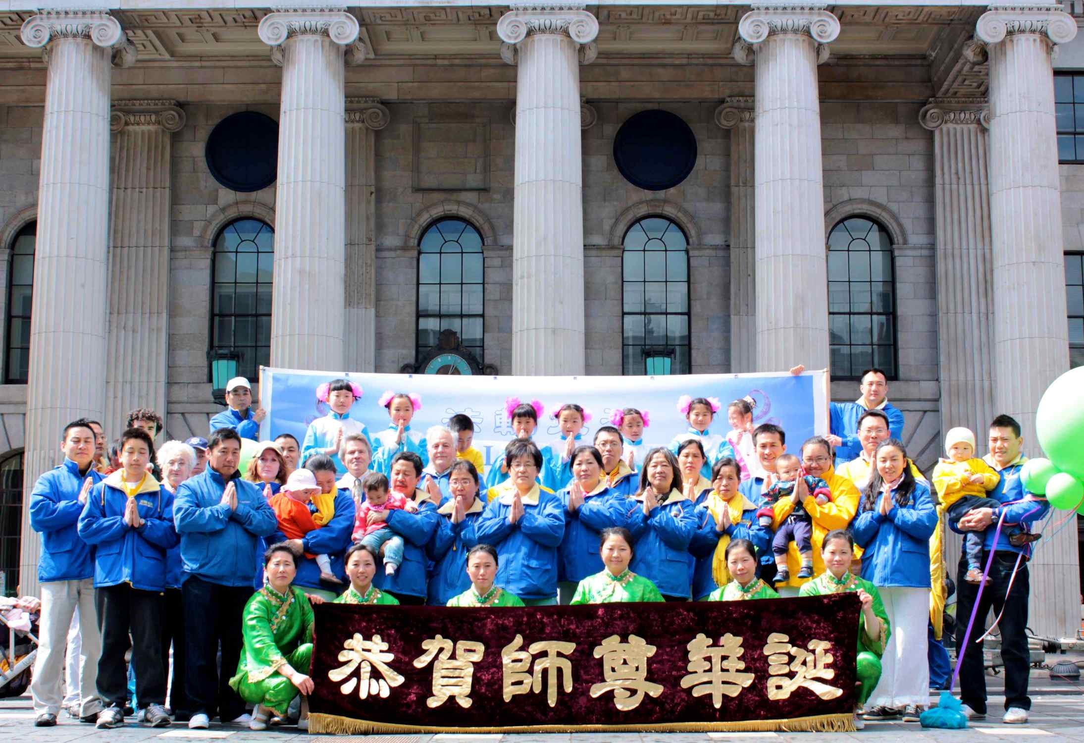 游行之后,庆典继续在光明之碑前进行。首先法轮功学员向他们最尊敬的李洪志老师祝贺生日快乐。