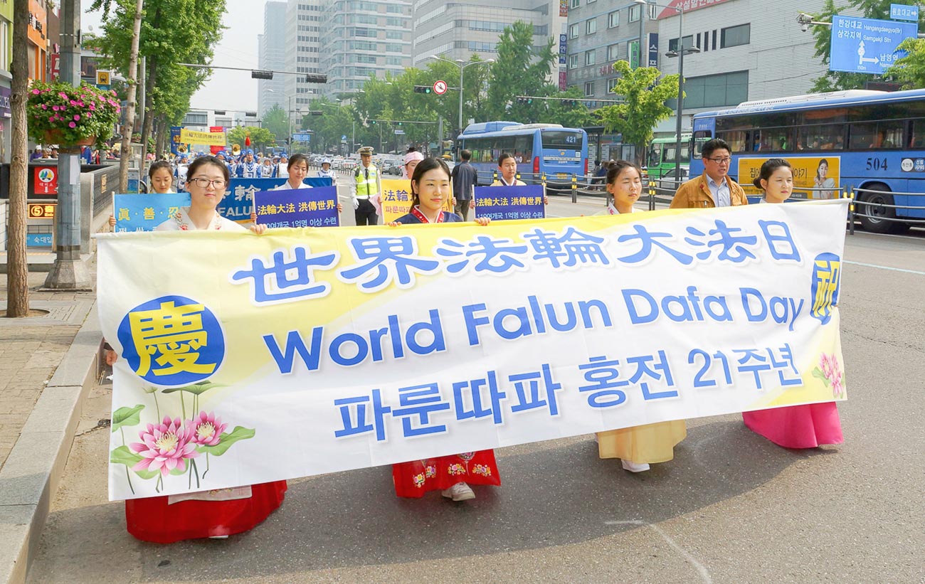 上午的庆祝集会结束后,下午二点,开始了庆祝游行。游行队伍从首尔站启程,继身穿华丽韩服、手举横幅的领先队列之后,是天国乐团的雄壮演奏和腰鼓队、横幅队列、炼功演示队列、遗像队列等,队伍全长约达一公里。庆祝“世界法轮大法日”的飞船全天飞旋在首尔的汝矣岛-汉江-蚕室之间的上空,增添了节日气氛。