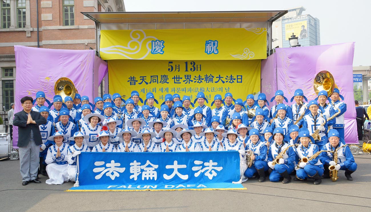 在韩国交通的心脏——首尔站进行节日祝歌献唱和乐器演奏、功法示范、天国乐团合奏、法轮功真相图片展等,吸引大批市民们驻足观看。整个庆祝活动气氛隆重祥和。